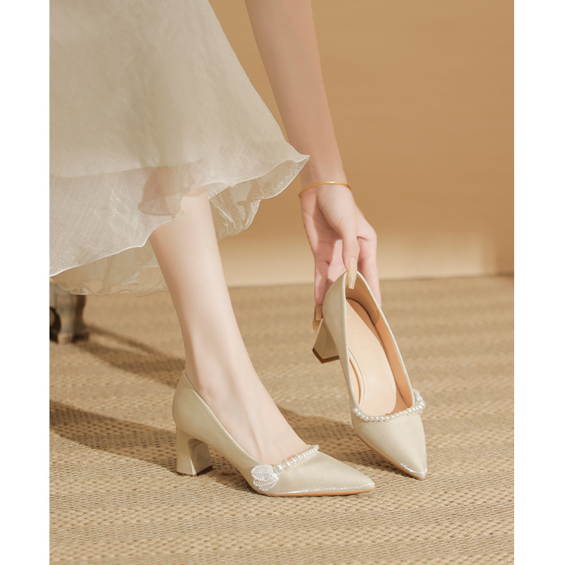 法式珍珠粗跟高跟鞋设计感小众气质缎面尖头礼服伴娘鞋浅色
