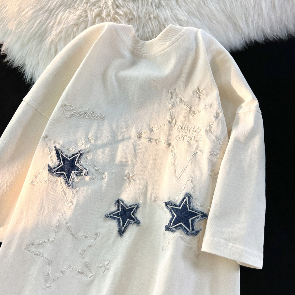 国潮高街刺绣星星短袖t恤女纯棉夏季美式宽松ins潮牌情侣半袖上衣
