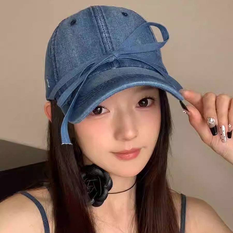 设计感蝴蝶结牛仔棒球帽子女系带甜美 复古ins大头围显脸小鸭舌帽