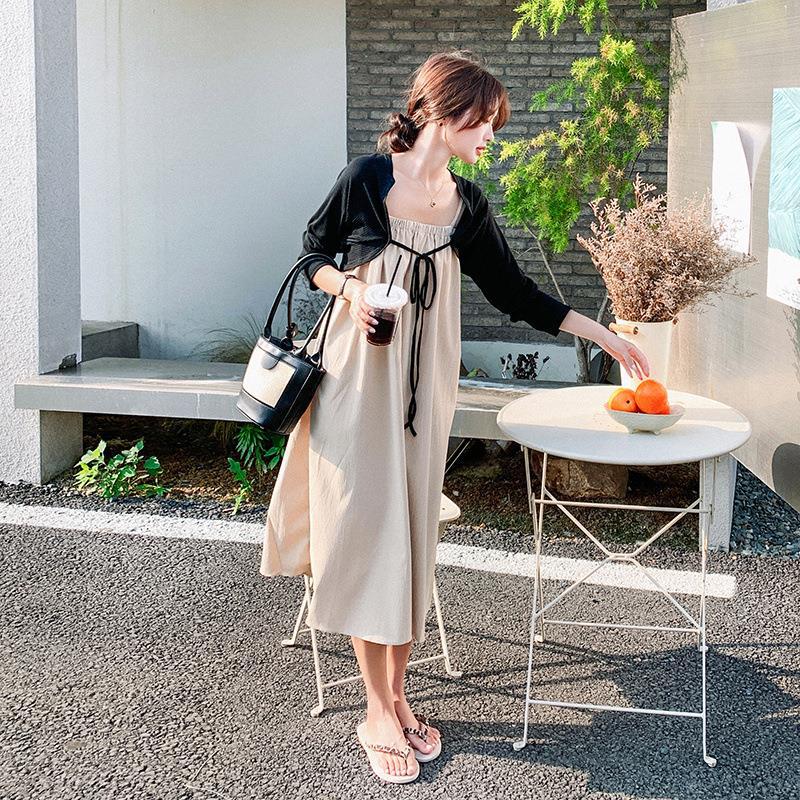 实拍抽褶领口法式显瘦宽松随性长款吊带裙短款系带黑色披肩套装女