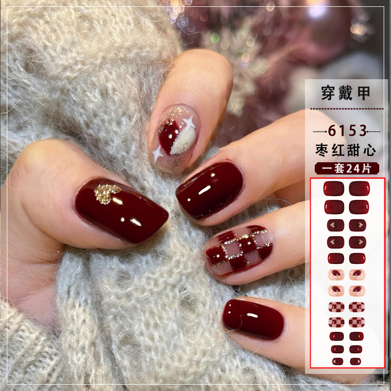 枣红甜心穿戴甲片显白棋盘格爱心可拆卸假指甲片美甲指甲贴甲片贴