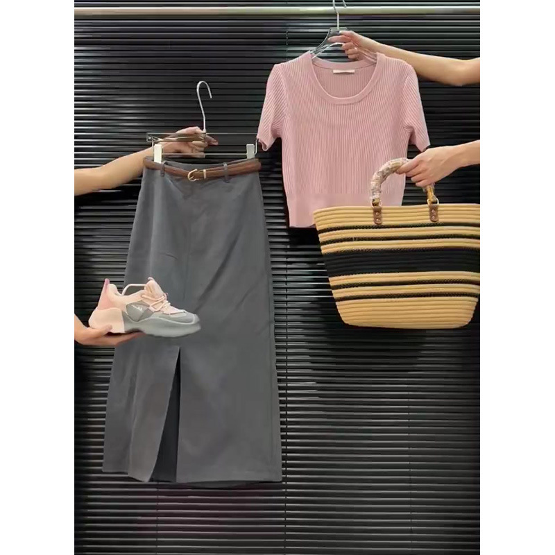 夏季新款小个子穿搭一整套时尚小香风粉色上衣半身裙两件套装