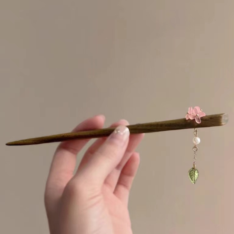 绿檀木珍珠粉色花瓣簪子樱花绿叶配饰木质新中式古风汉服盘发簪子