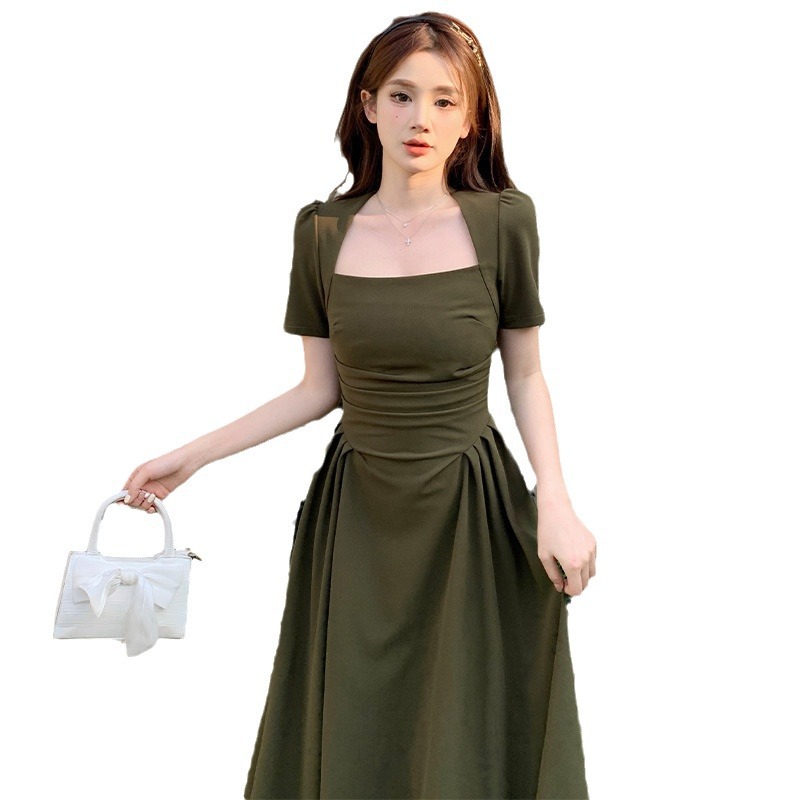 夏季收腰褶皱连衣裙小个子短裙方领短袖修身显瘦橄榄绿裙子