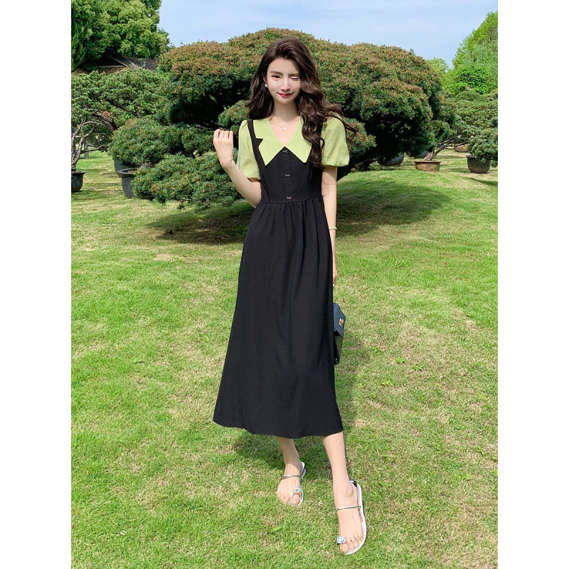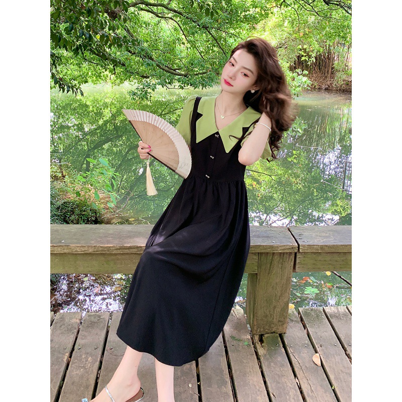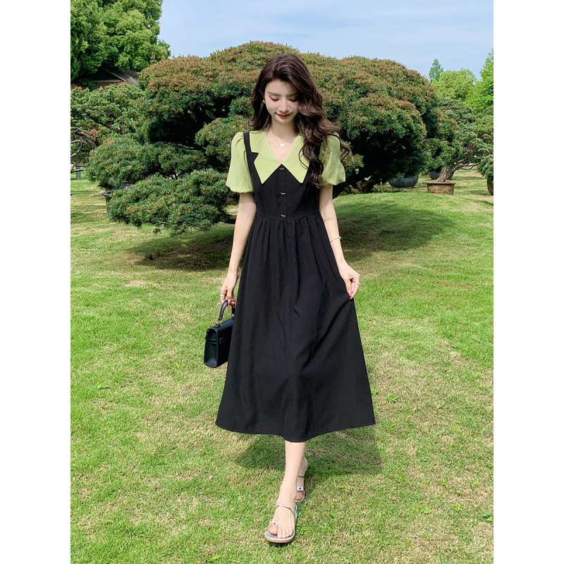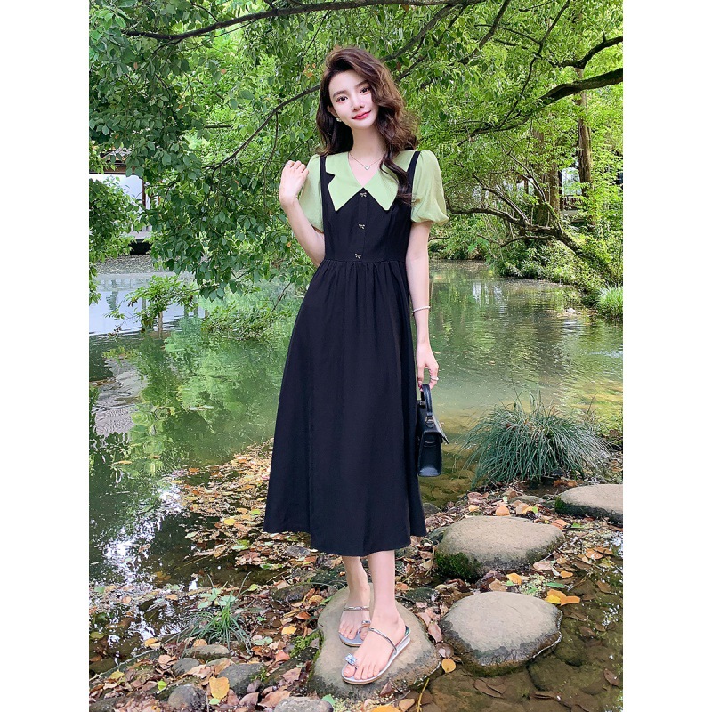 少女的夏天短袖连衣裙夏季新款假两件法式翻领长裙