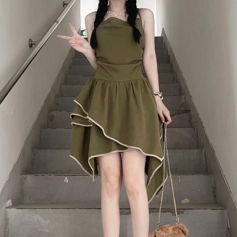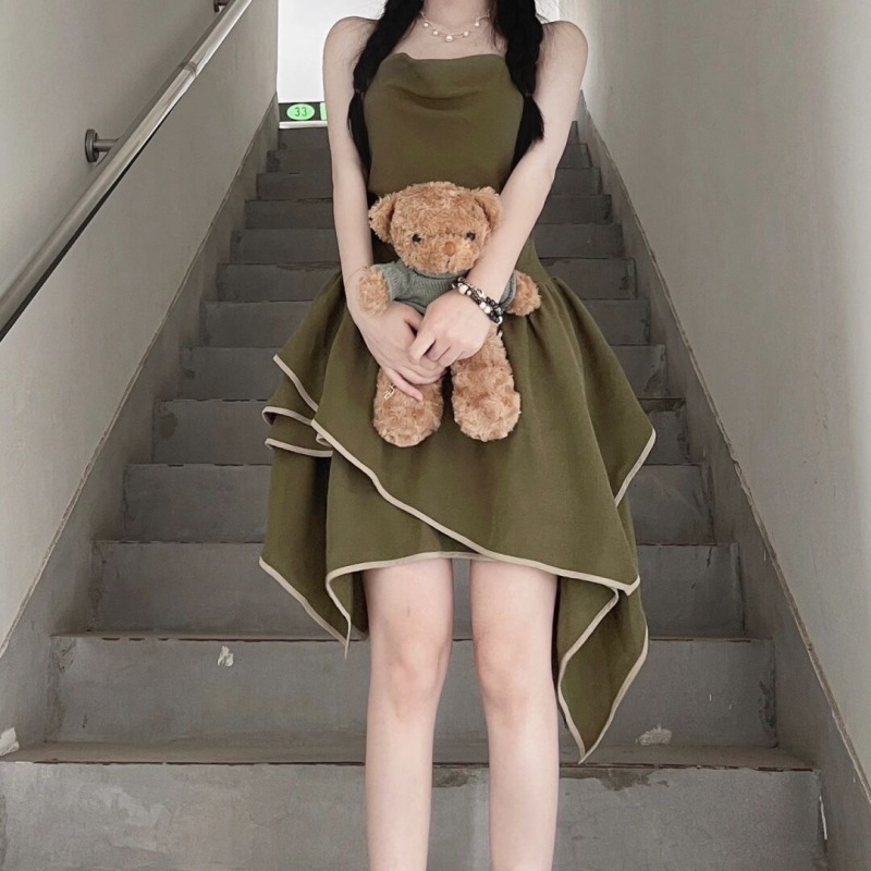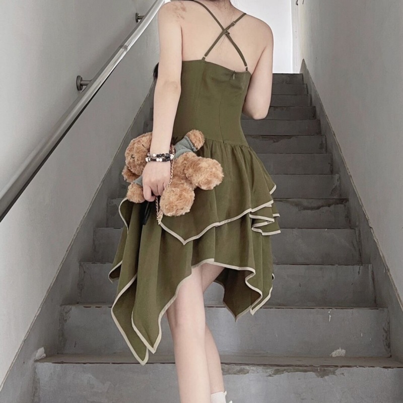 新款绿色吊带连衣裙子女夏季小个子不规则高级设计感辣妹短裙