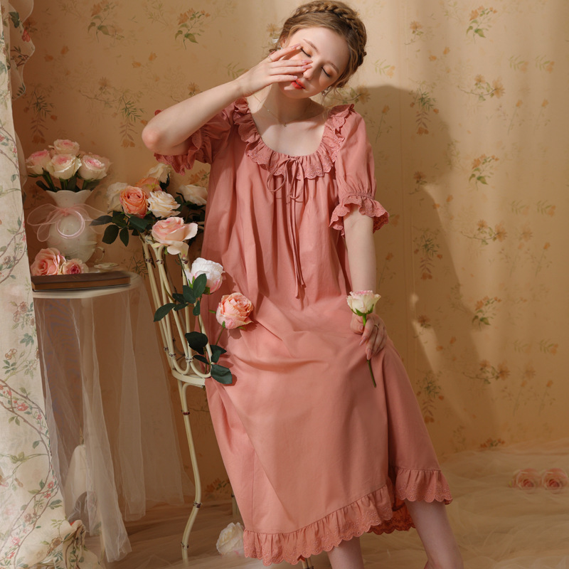 法式公主睡裙少女夏季棉绣花新款短袖长款甜美睡衣可爱可外穿长裙