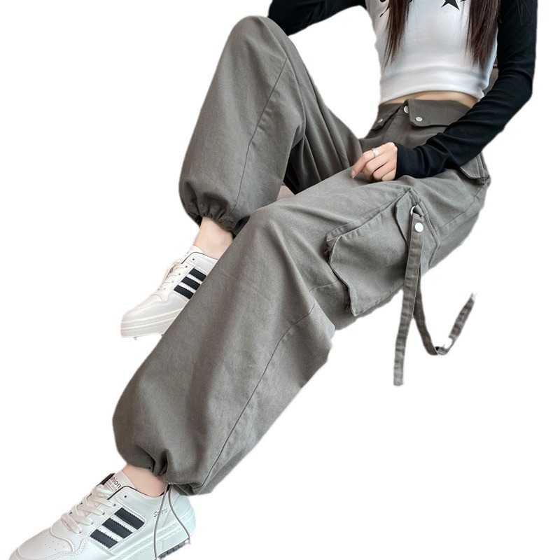 现货美式工装裤女春季新款设计感翻边高腰阔腿束脚运动裤