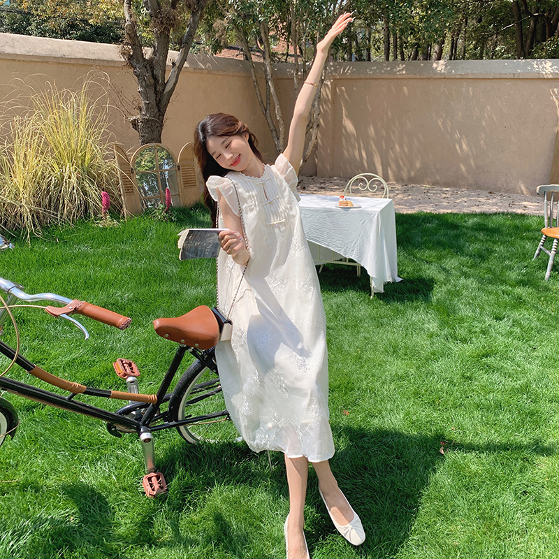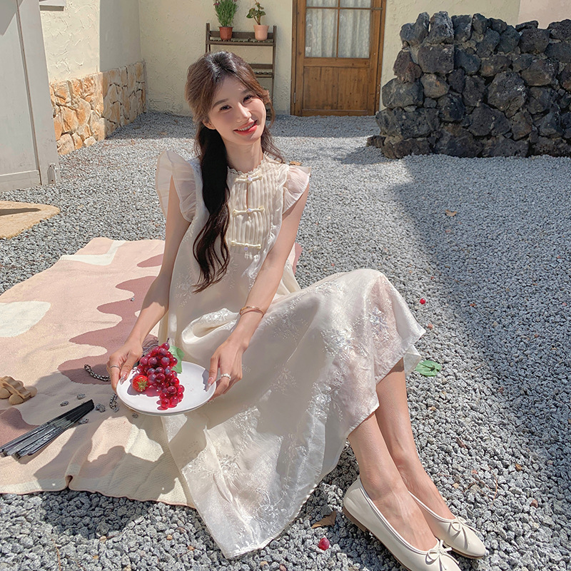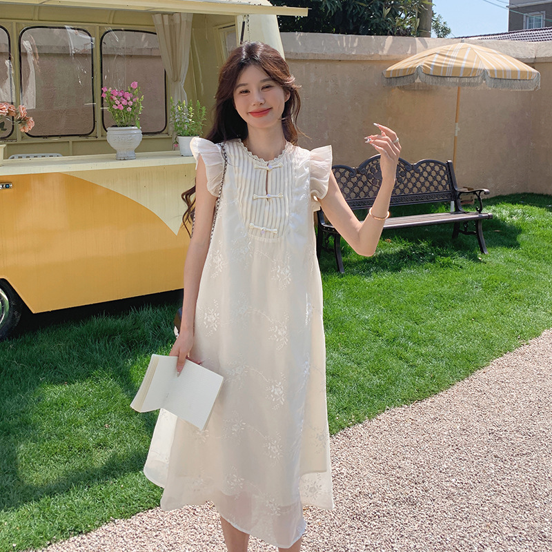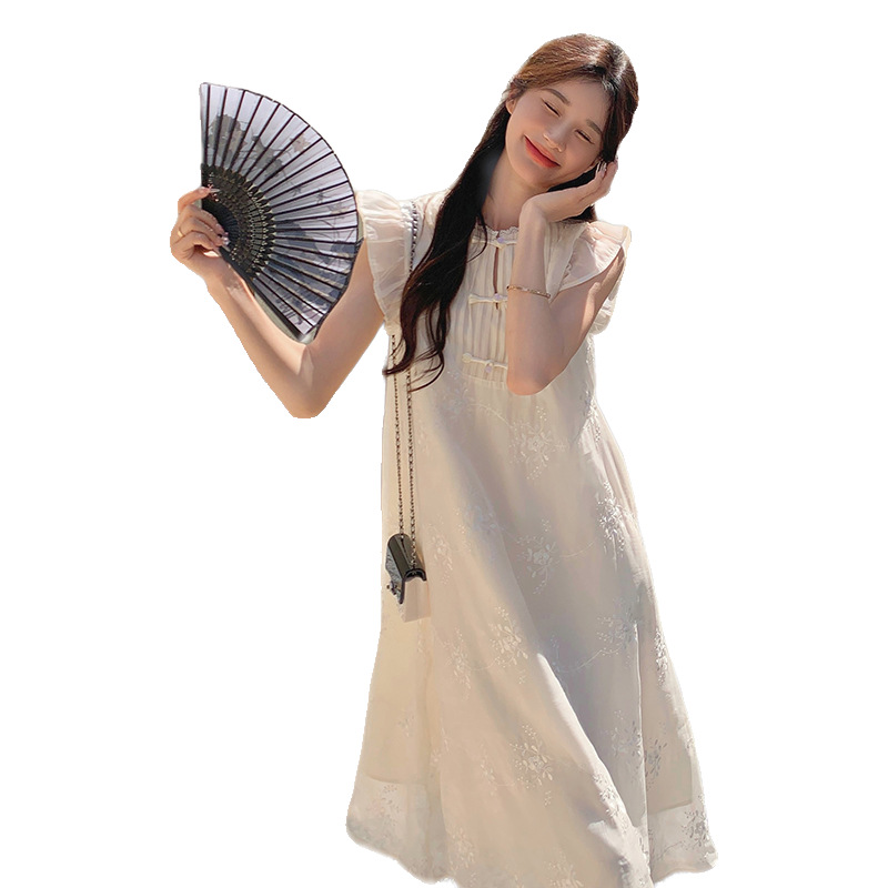 米白色新中式刺绣小飞袖连衣裙夏装新款小个子气质短袖连衣裙