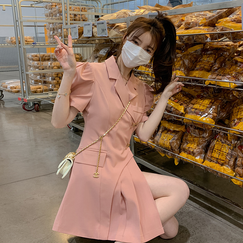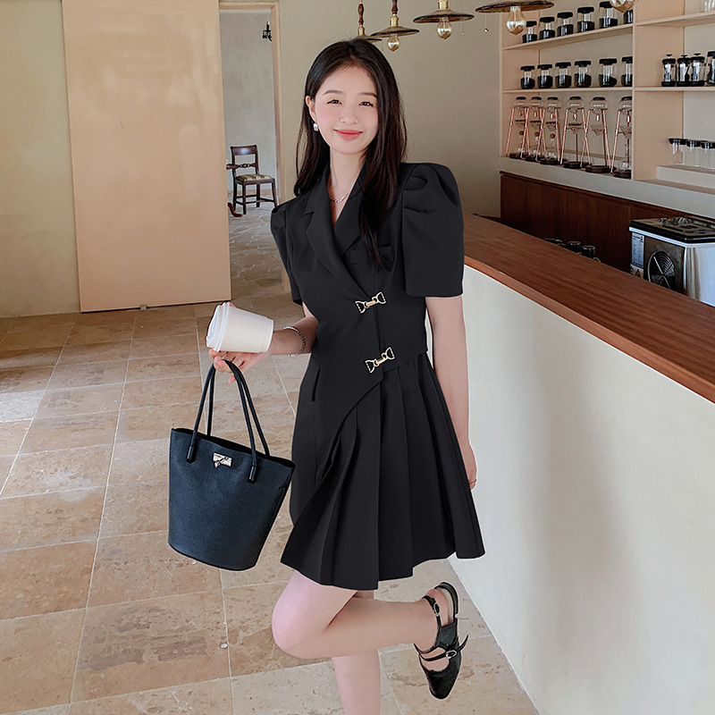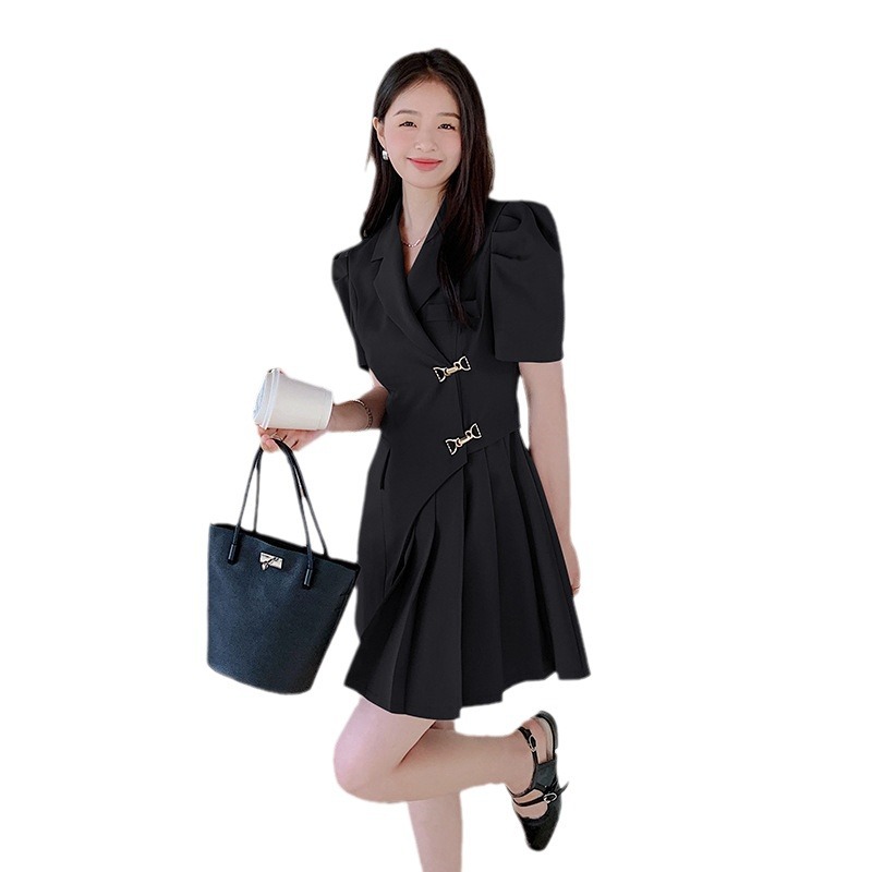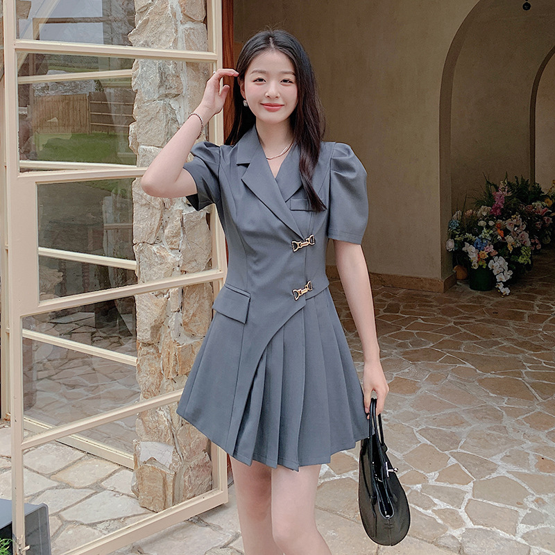 灰色法式设计感西装连衣裙夏装小个子收腰不规则百褶连衣裙女