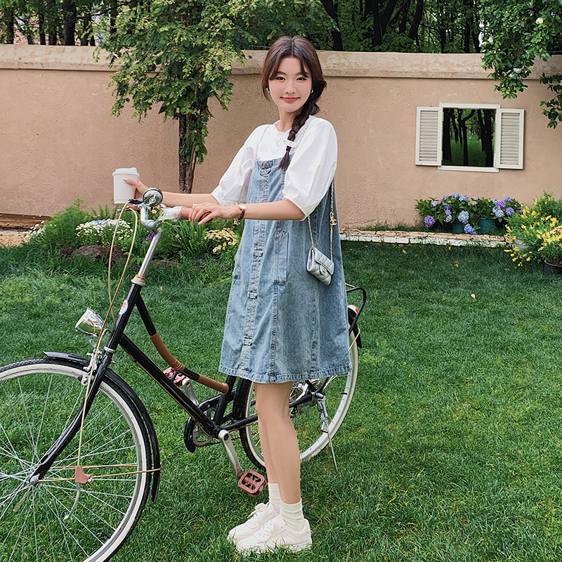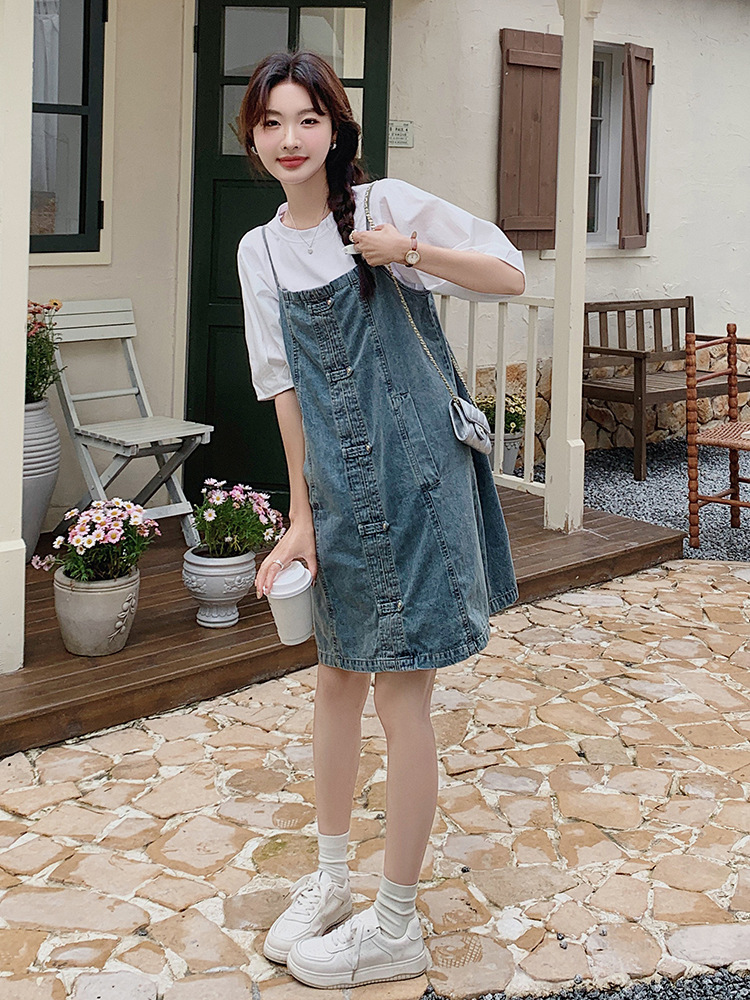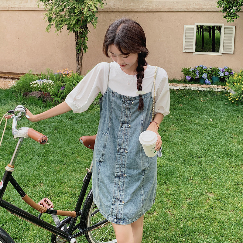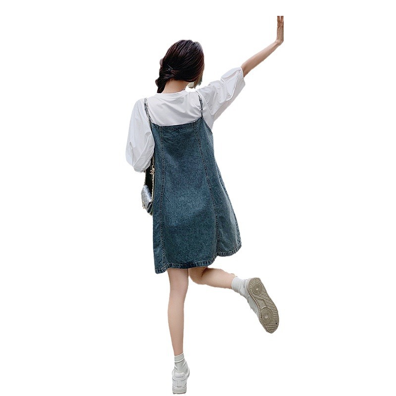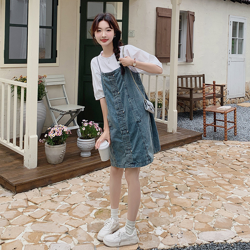 时尚背带白T套装复古牛仔连衣裙女夏季新款小个子收腰显瘦a字
