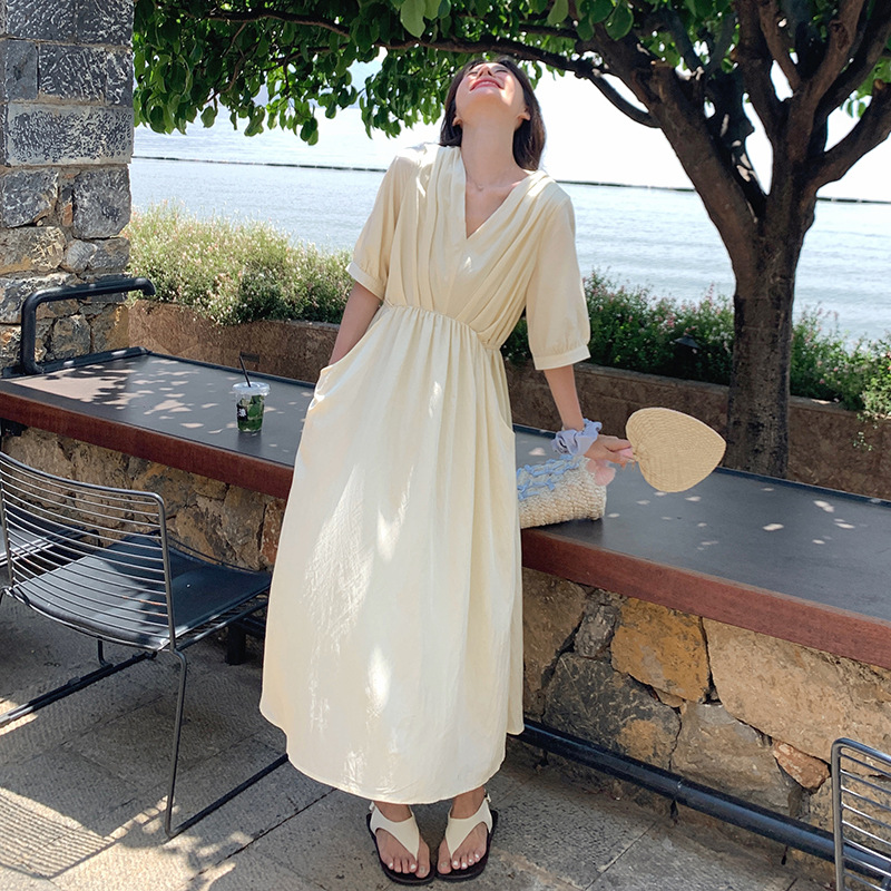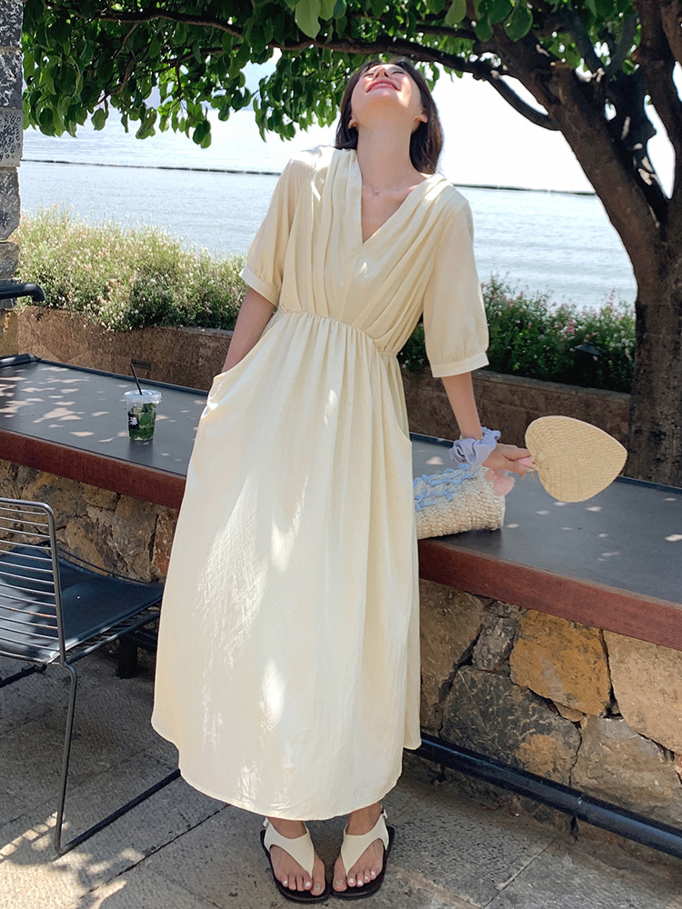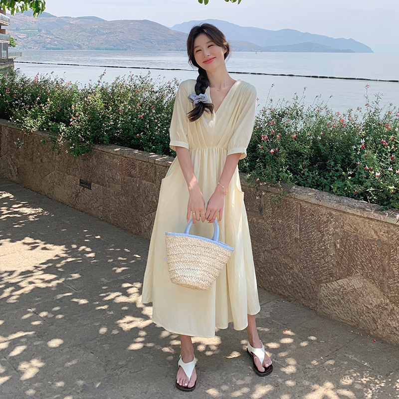 法式温柔风V领奶黄色年小清新茶歇连衣裙子女装夏季新款初恋