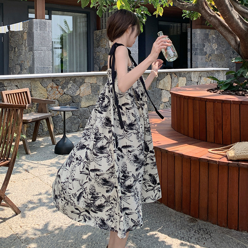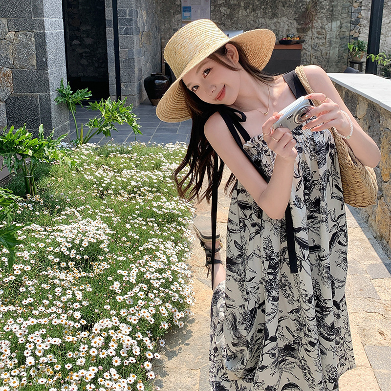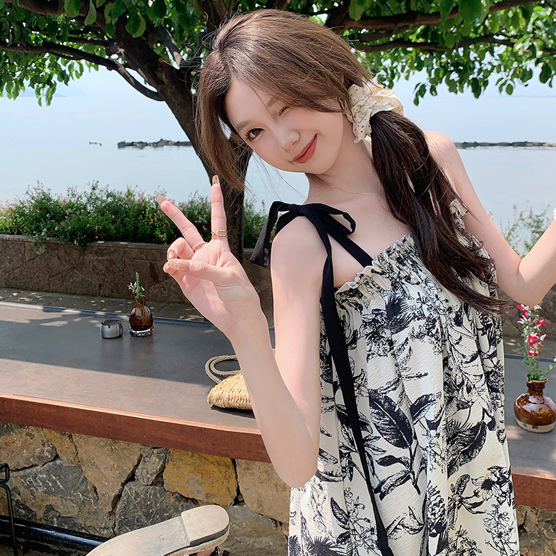 不对称绑带沙滩甜美仙女长裙新款法式吊带海边度假连衣裙
