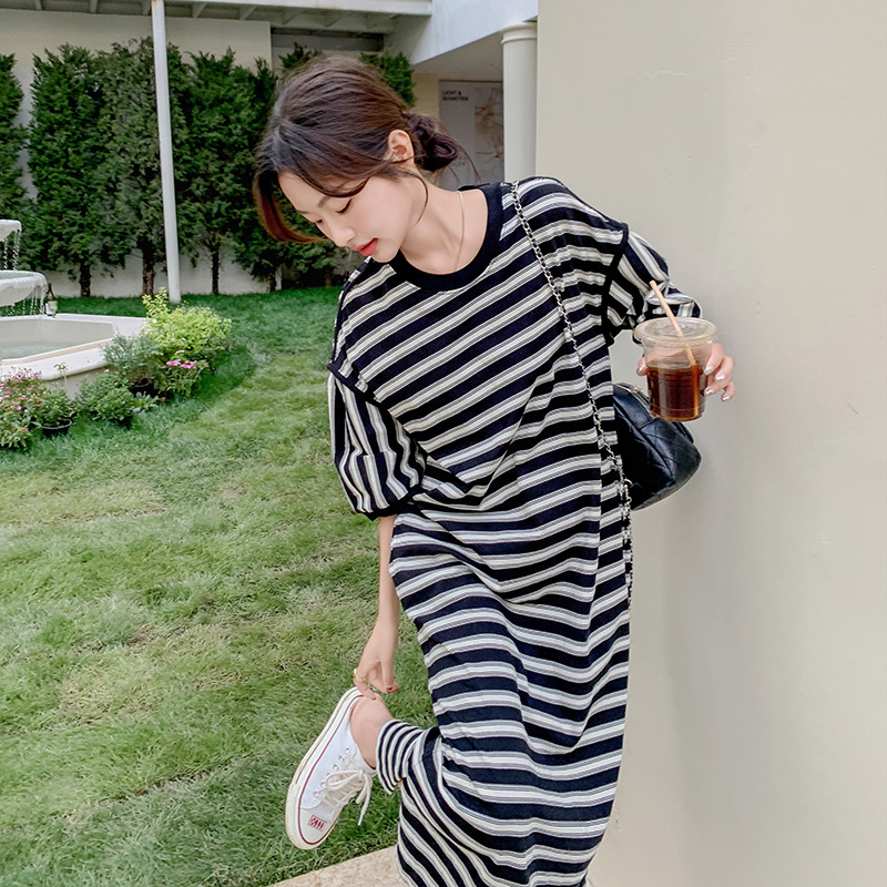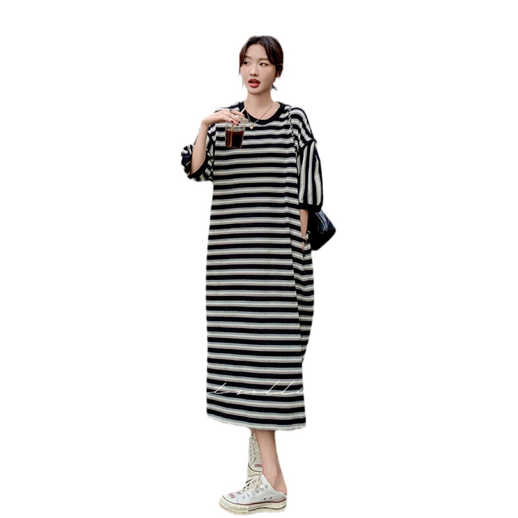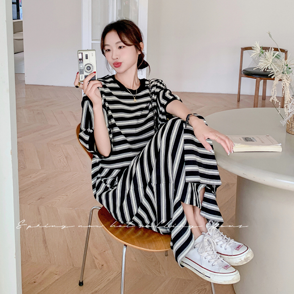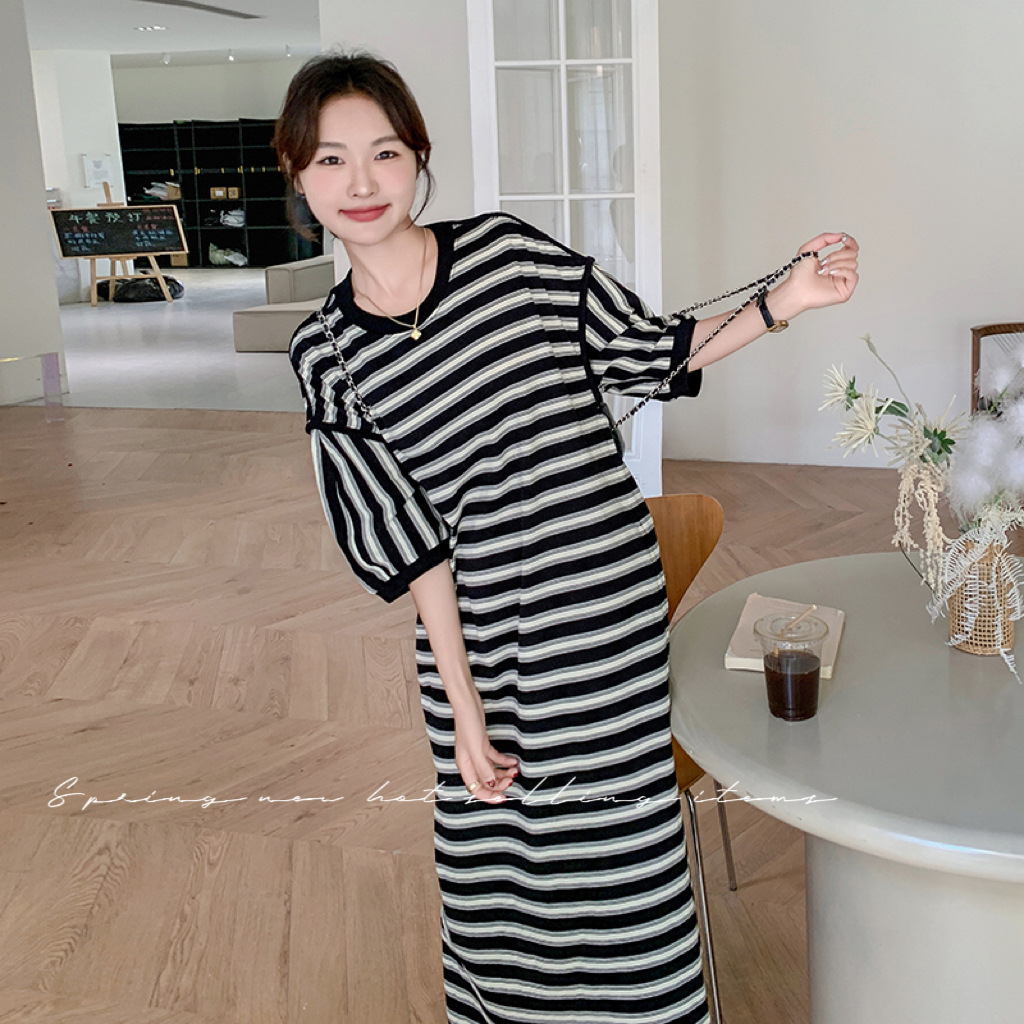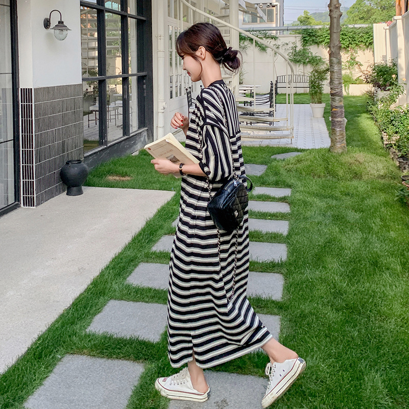 新款慵懒风条纹欧洲站年新款法式宽松气质短袖休闲连衣裙