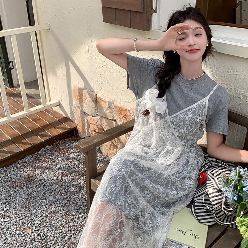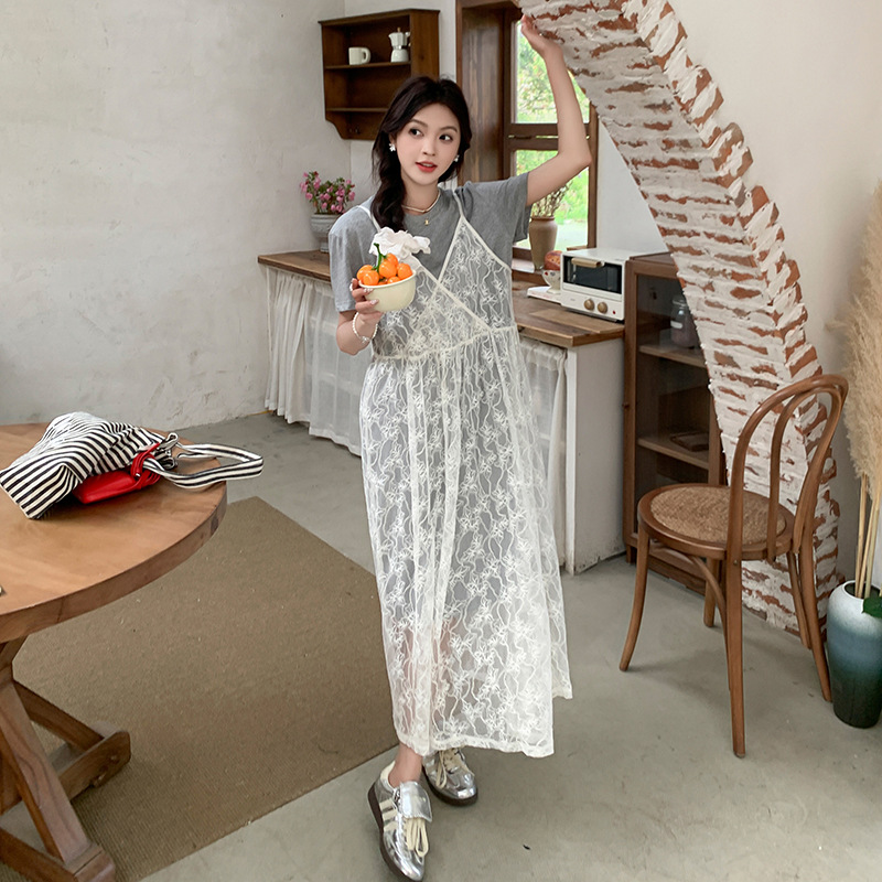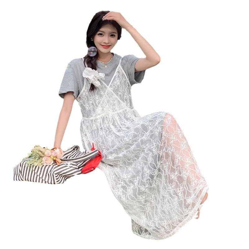 两件套蕾丝吊带连衣裙套装新款白色气质减龄镂空设计感连衣裙女
