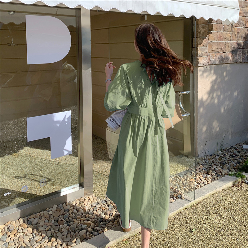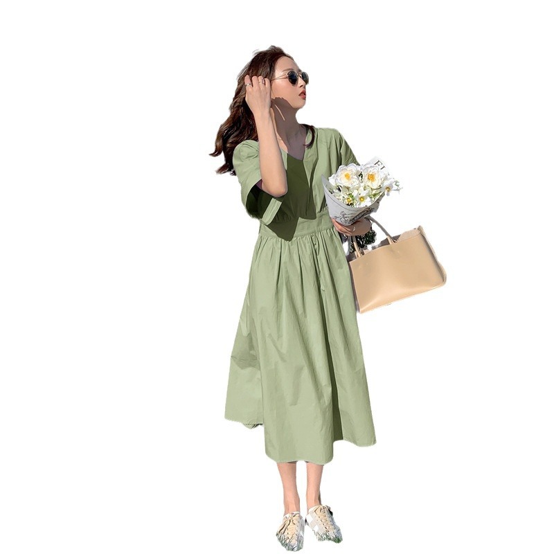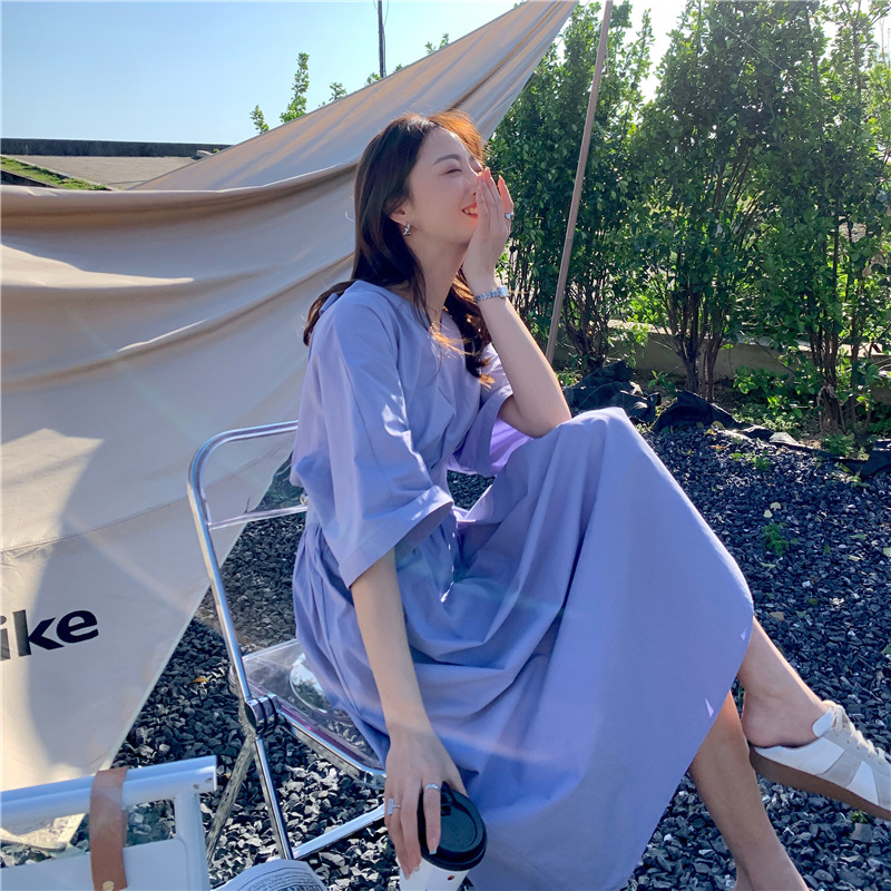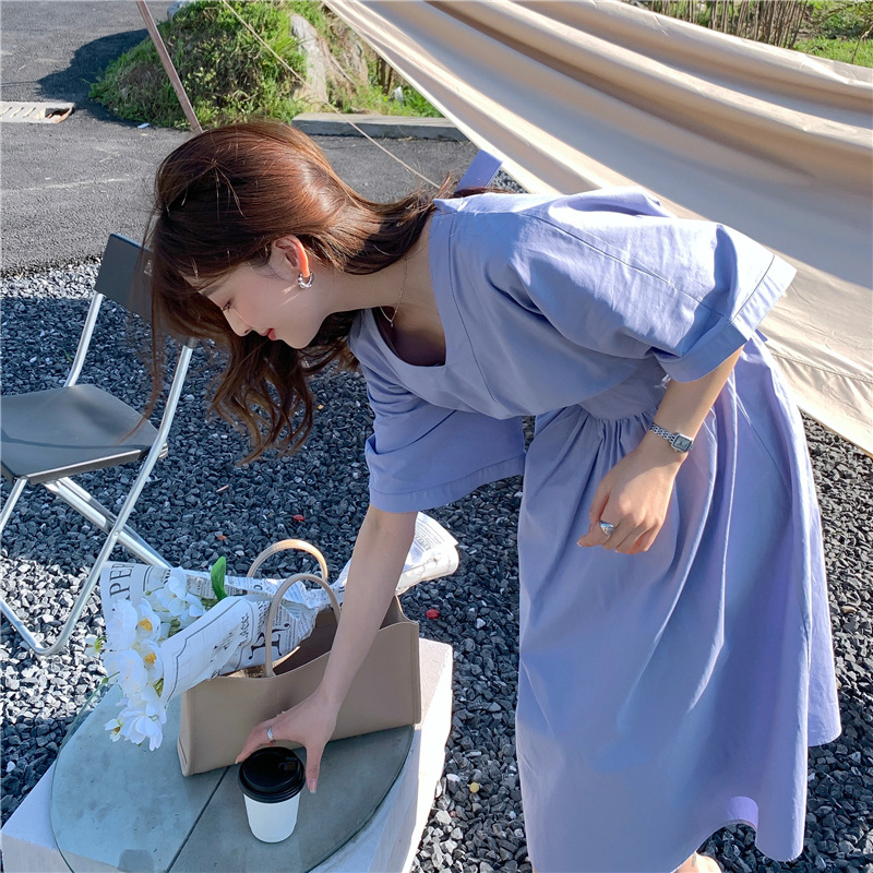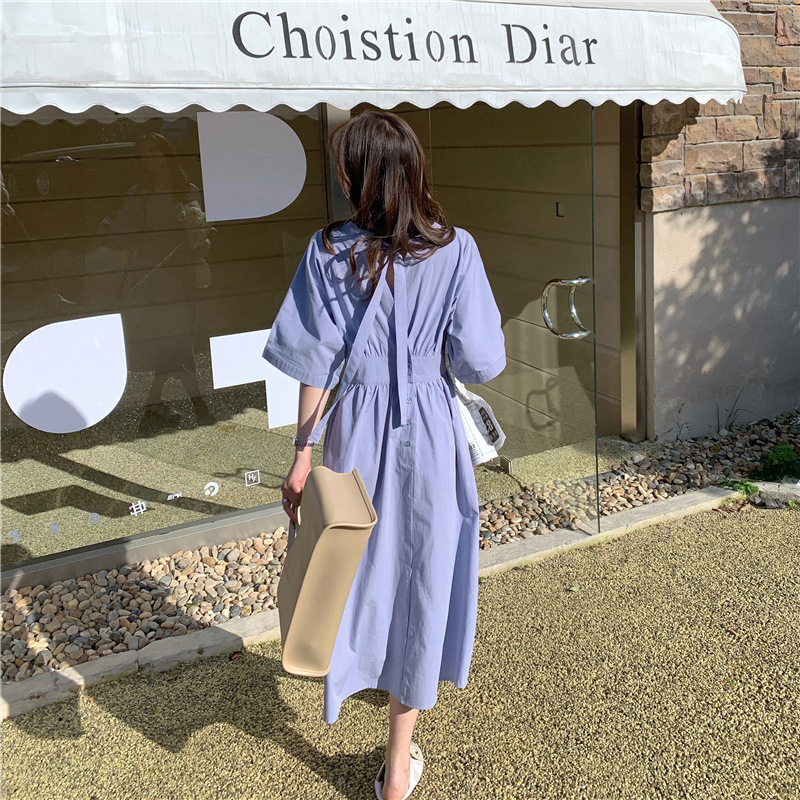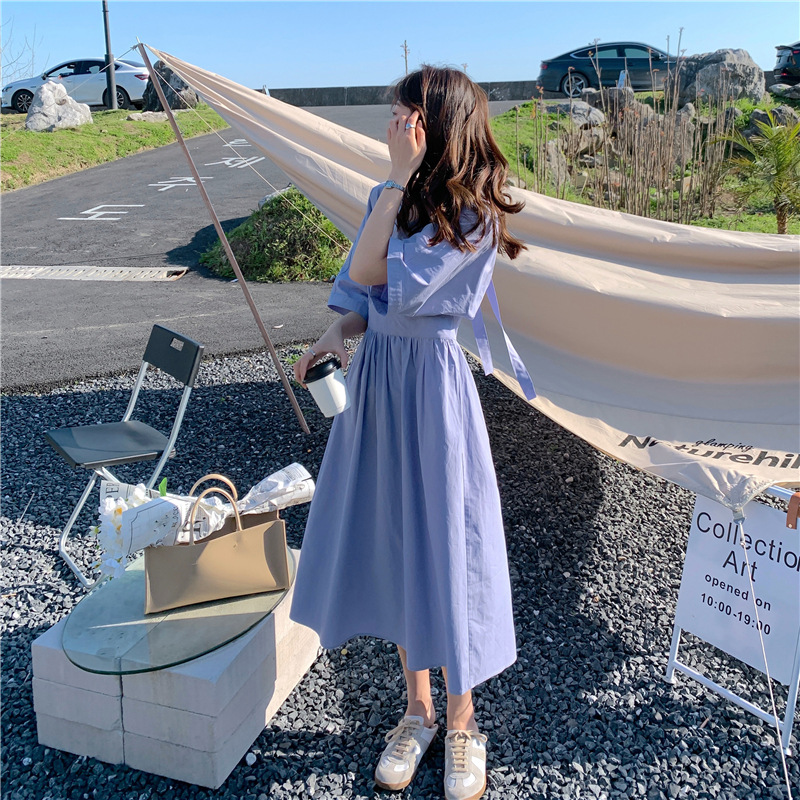 学院风蓝色子女装夏季新款小个子收腰后背蝴蝶结系带连衣裙