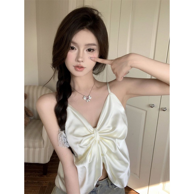 感气质缎面蝴蝶结小吊带背心夏季新款欲露背短款上衣女