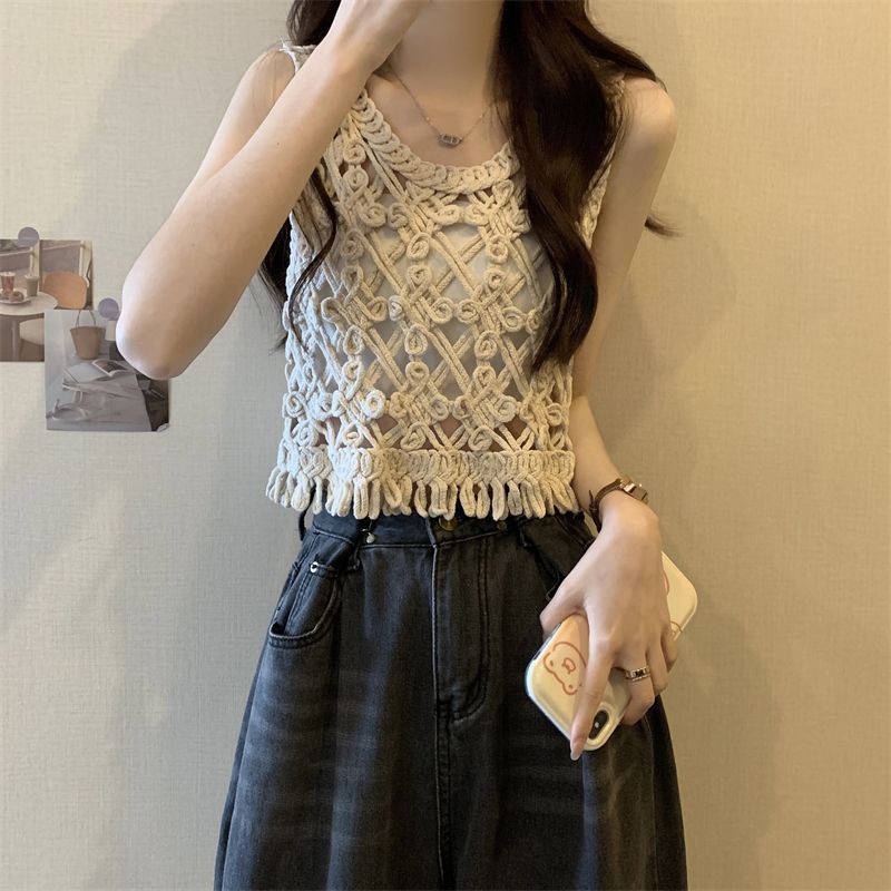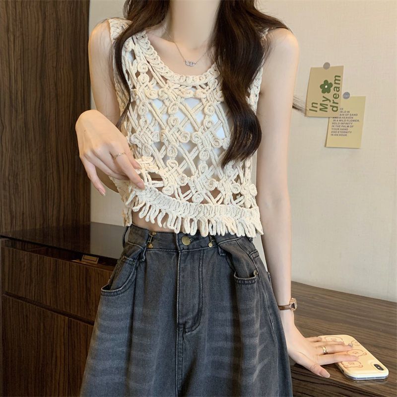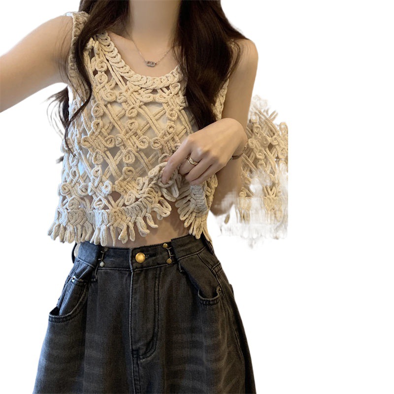 法式钩花镂空针织吊带背心女夏外穿新款甜辣妹设计感流苏短