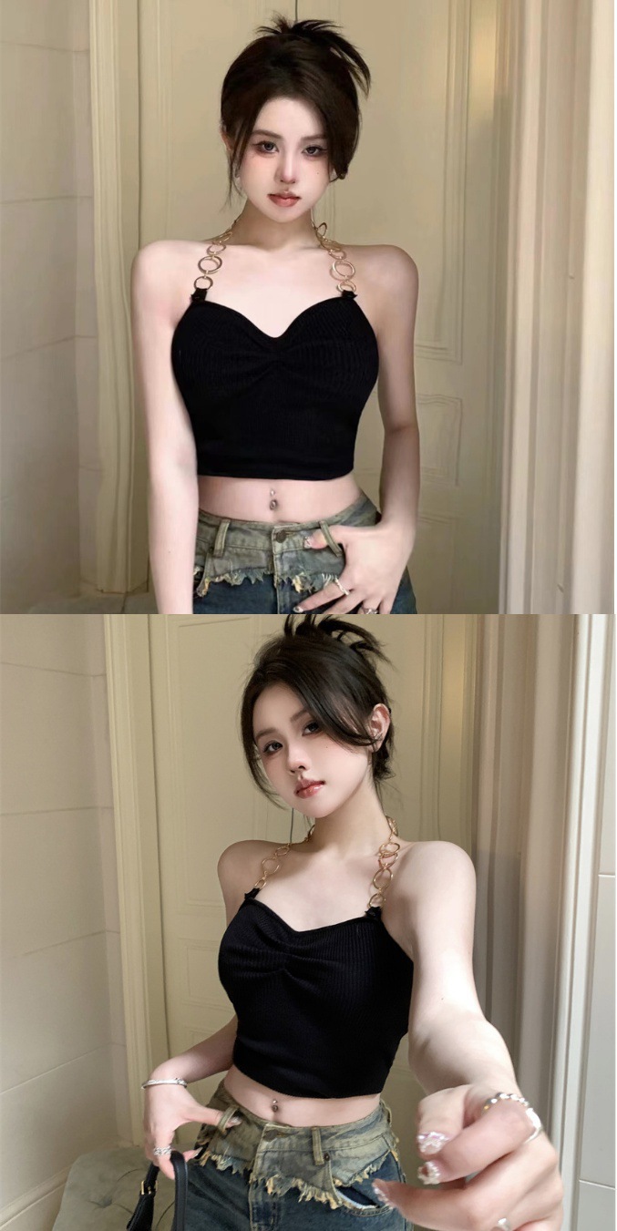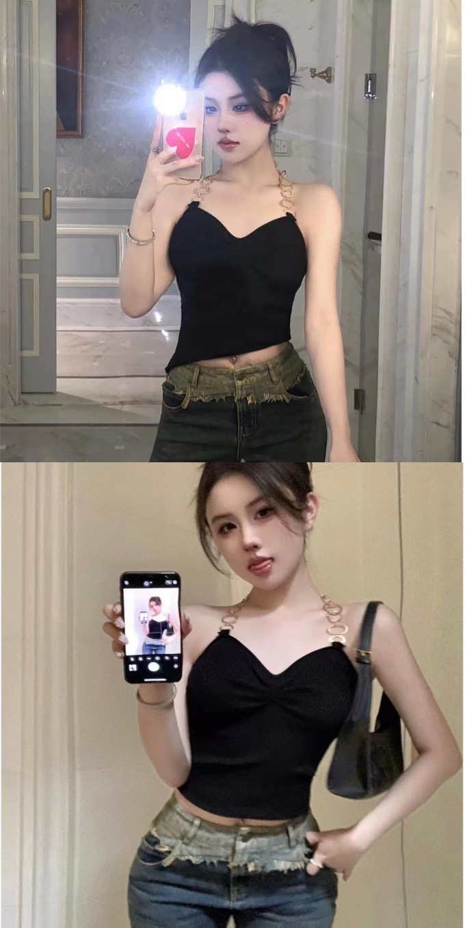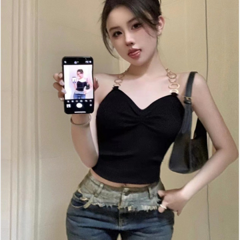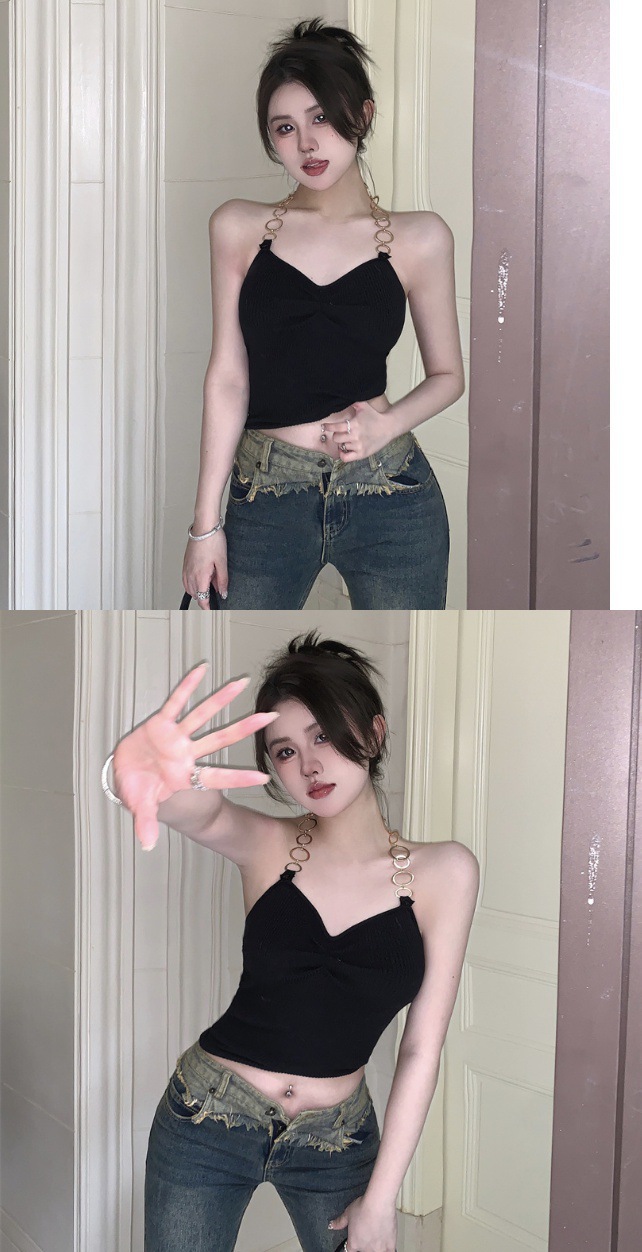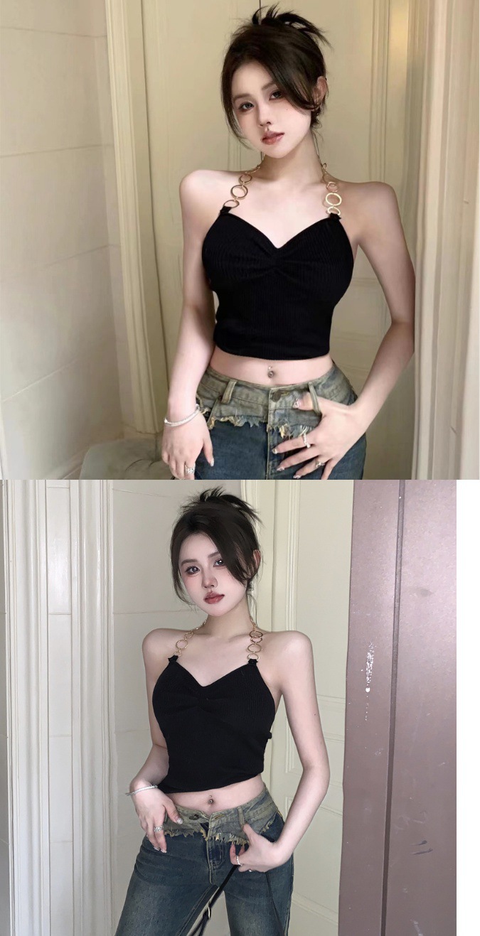 金属环挂脖式吊带背心女夏季小众欲甜辣妹性感紧身短款v领