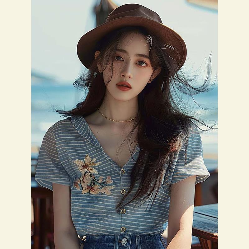 夏季新款小衫法式独特别致上衣法式气质小香风蓝色条纹衬衫女