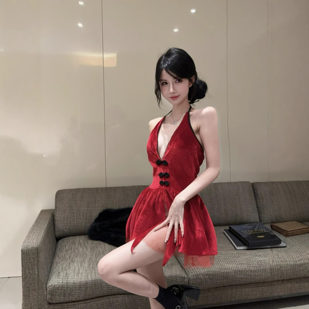 设计感挂脖气质纯欲圣诞深v领无袖露背红色丝绒礼服性感连衣裙女