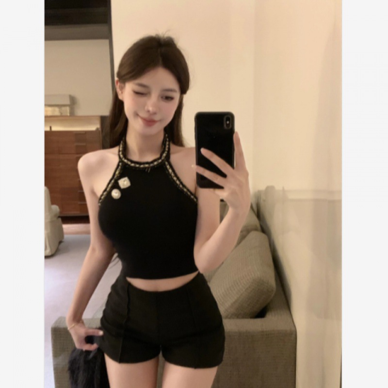 小香风重工链条水钻挂脖吊带背心女秋冬季气质内搭打底衫短