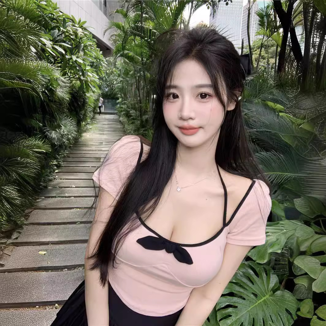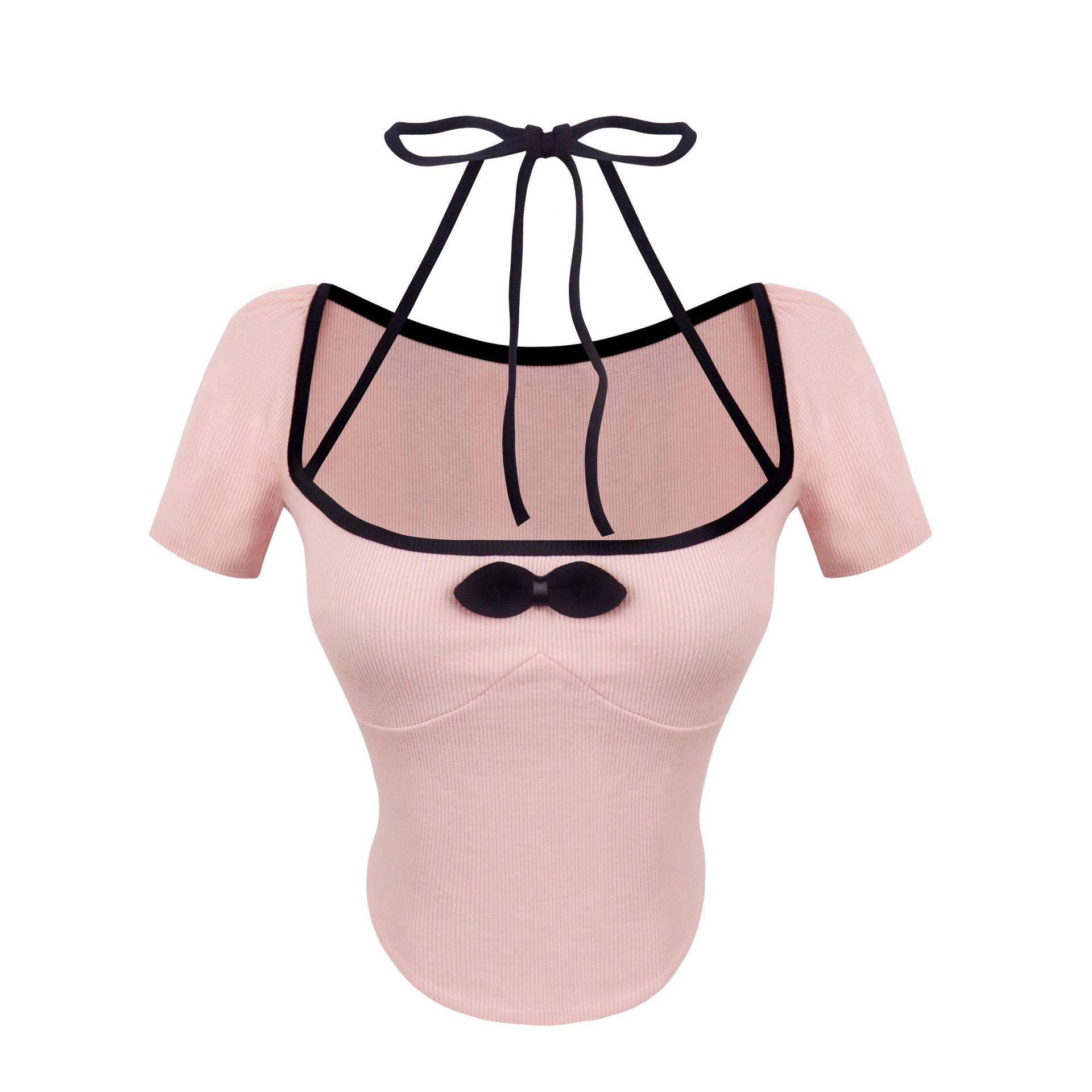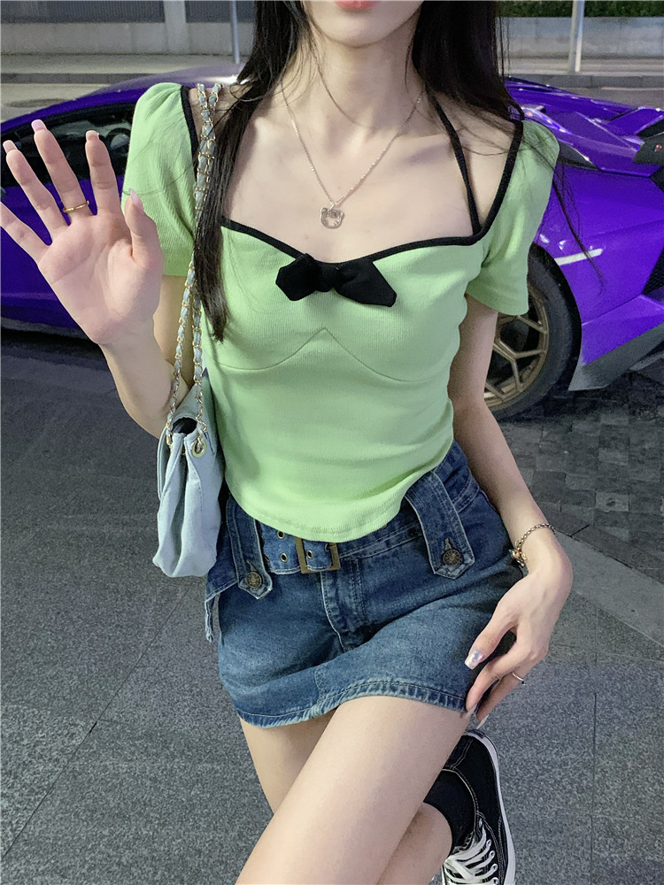 纯欲蝴蝶结U领性感露锁骨T恤女夏辣妹短袖上衣短款低胸紧身打底衫