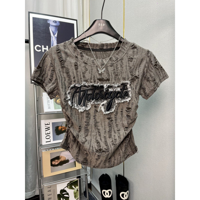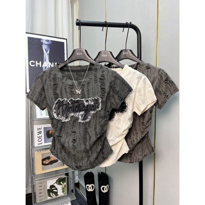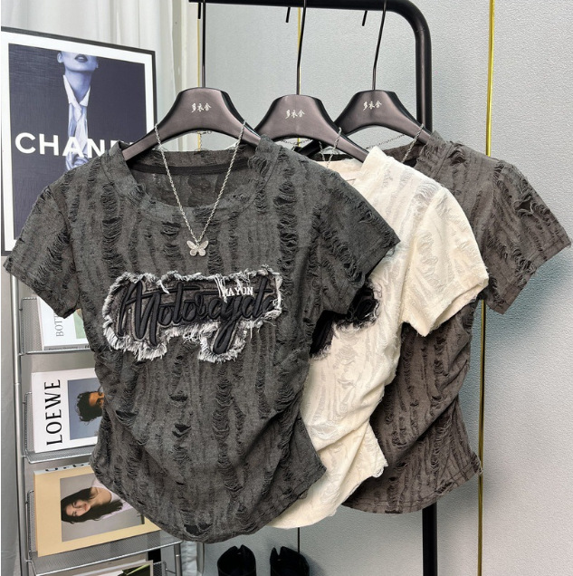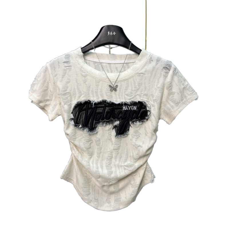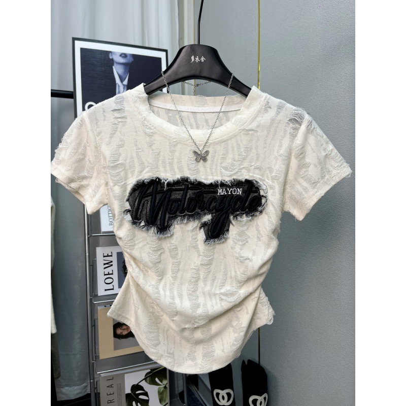 美式辣妹圆领扎染牛仔贴布短袖T恤女夏季新款设计感捏褶上衣