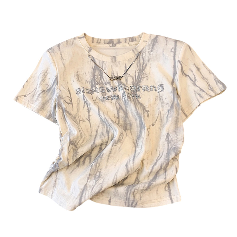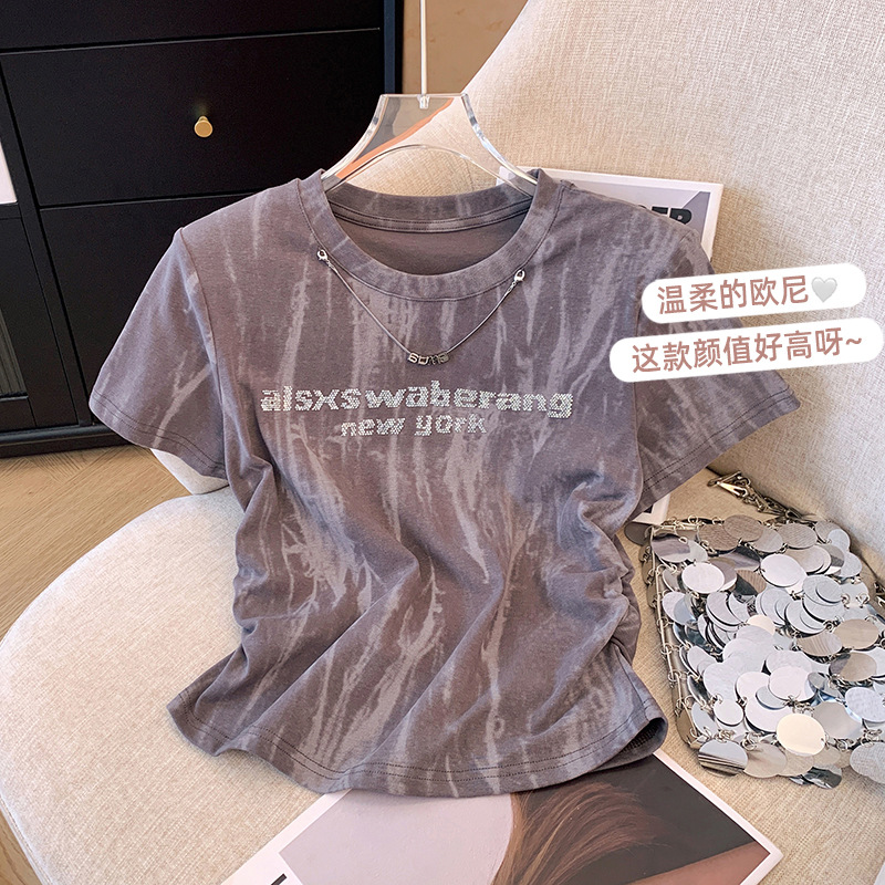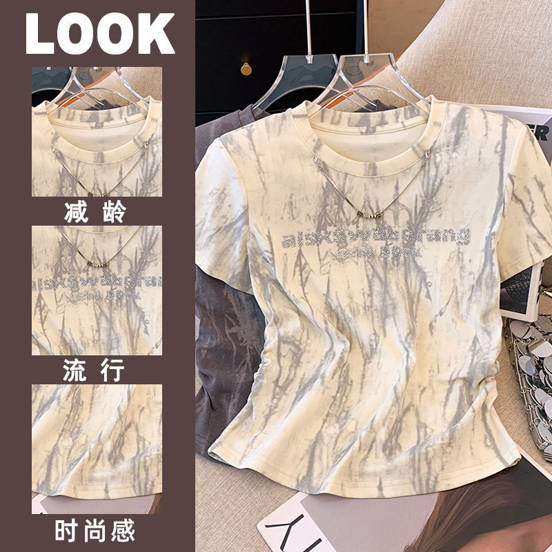 短款T恤女短袖夏季设计感小众扎染烫钻高腰修身小个子正肩上衣ins
