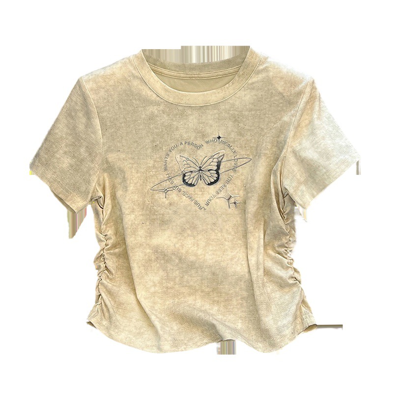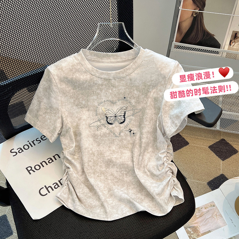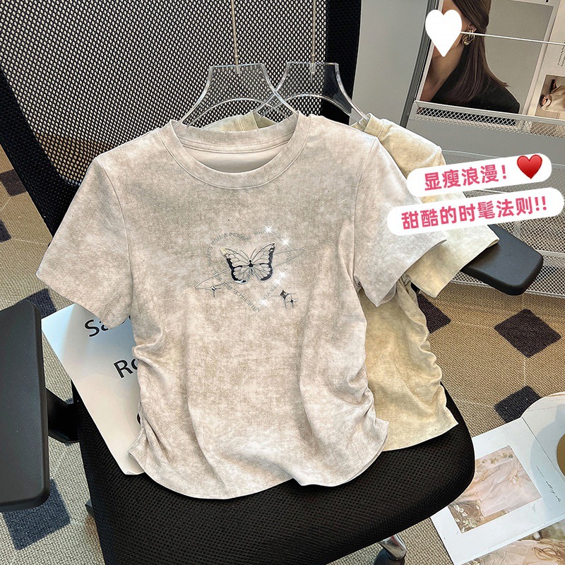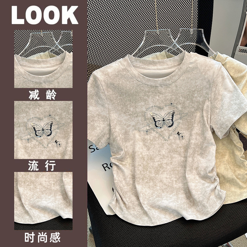 新款夏季新中式国风设计感正肩修身白色蝴蝶刺绣短袖T恤女