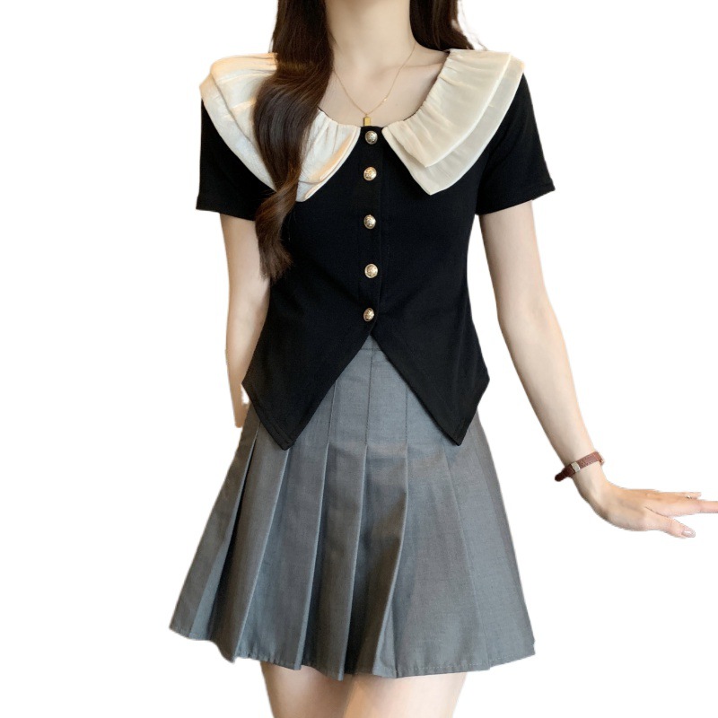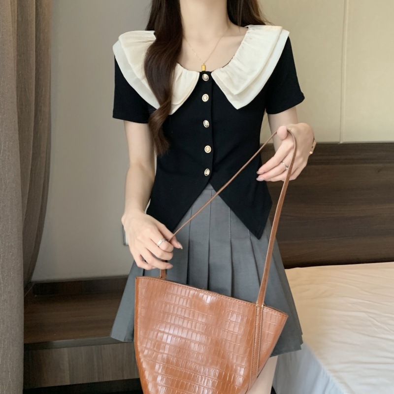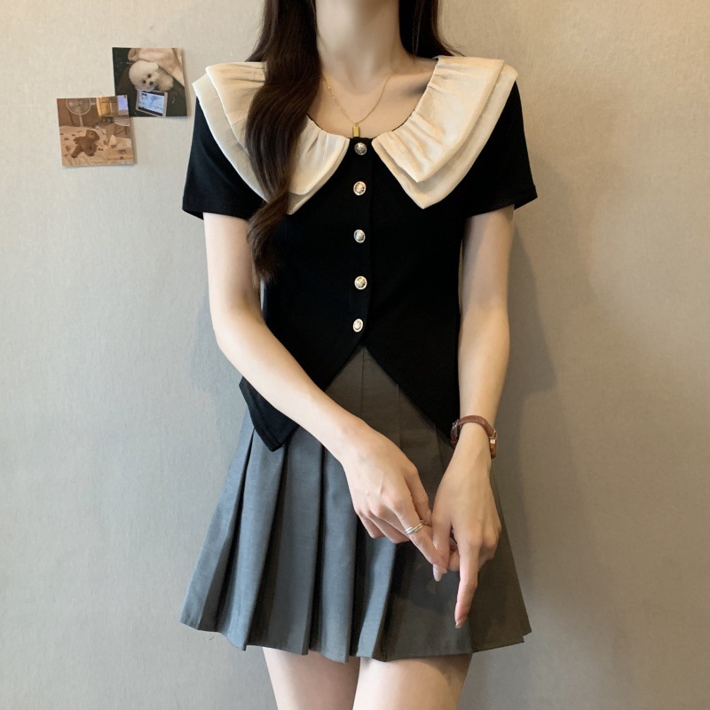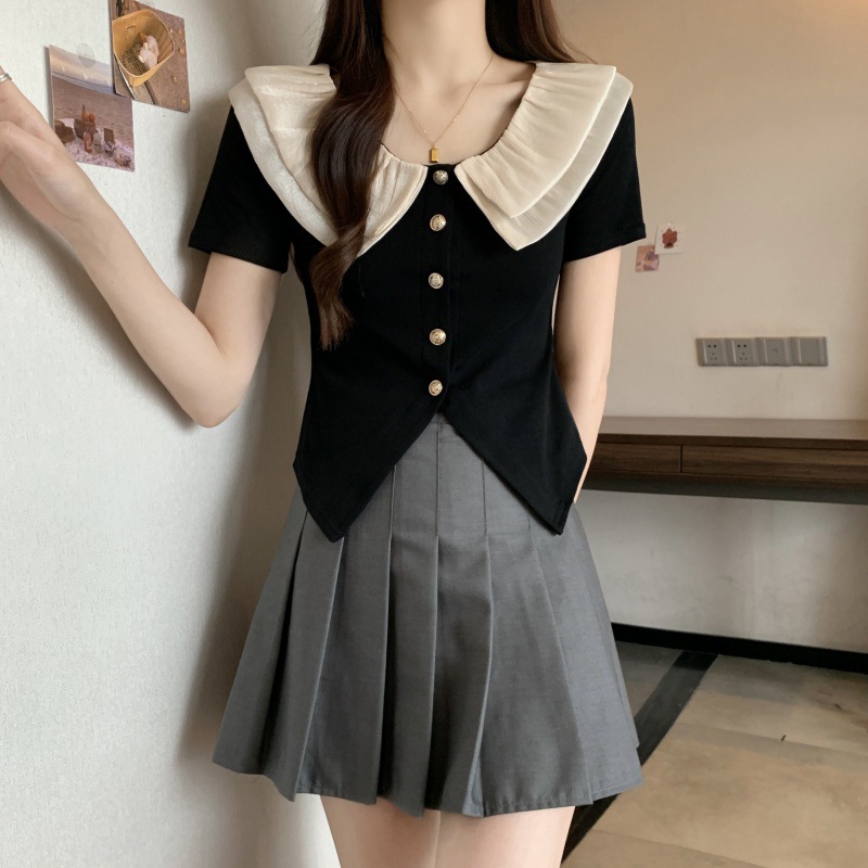 实拍夏款新款胖MM撞色双领设计感时尚百搭上衣纯欲风修身T恤