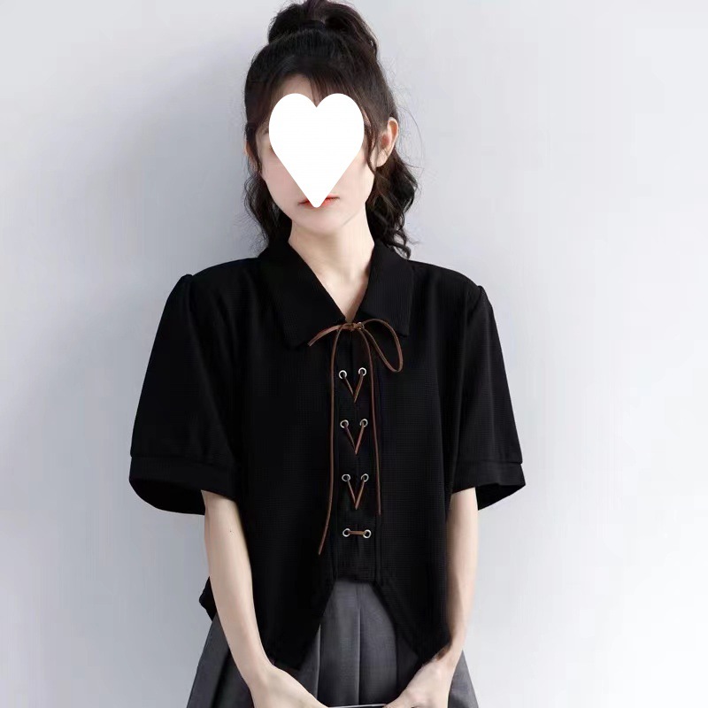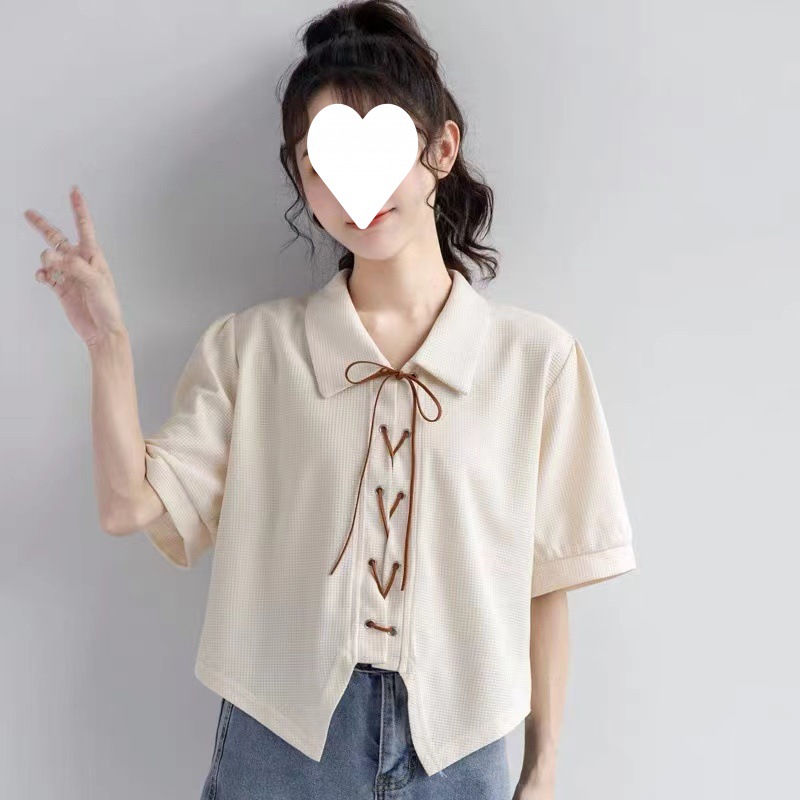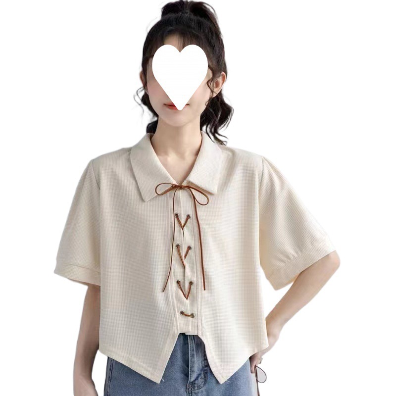 衫女绑带设计感夏季新款华夫格衬衣polo领短款上衣