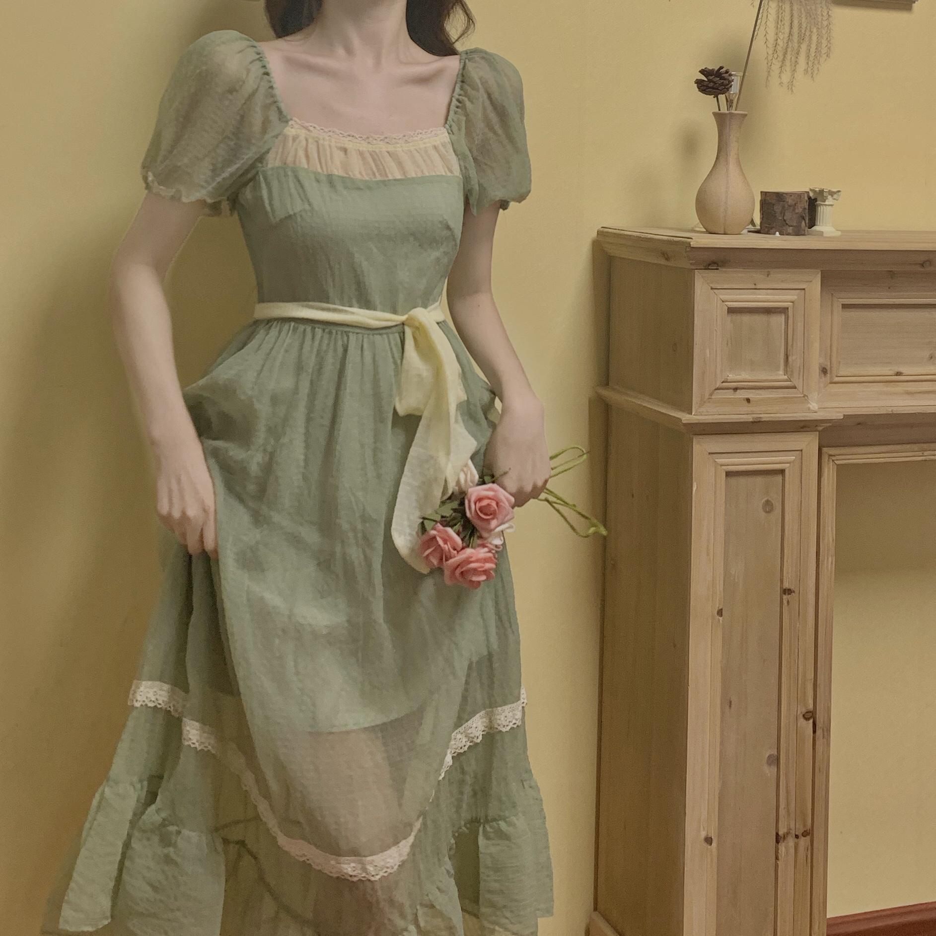 高级感法式复古绿色连衣裙夏季连衣裙纯欲宫廷风仙女公主裙子长款
