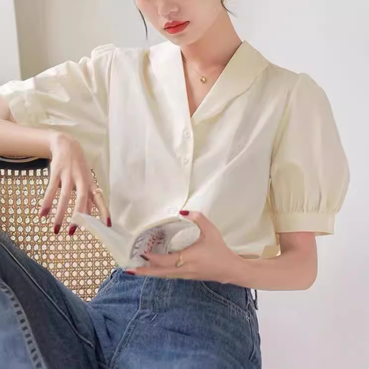 法式复古鹅黄色短袖衬衫女夏季气质甜美小衫设计感v领泡泡袖上衣
