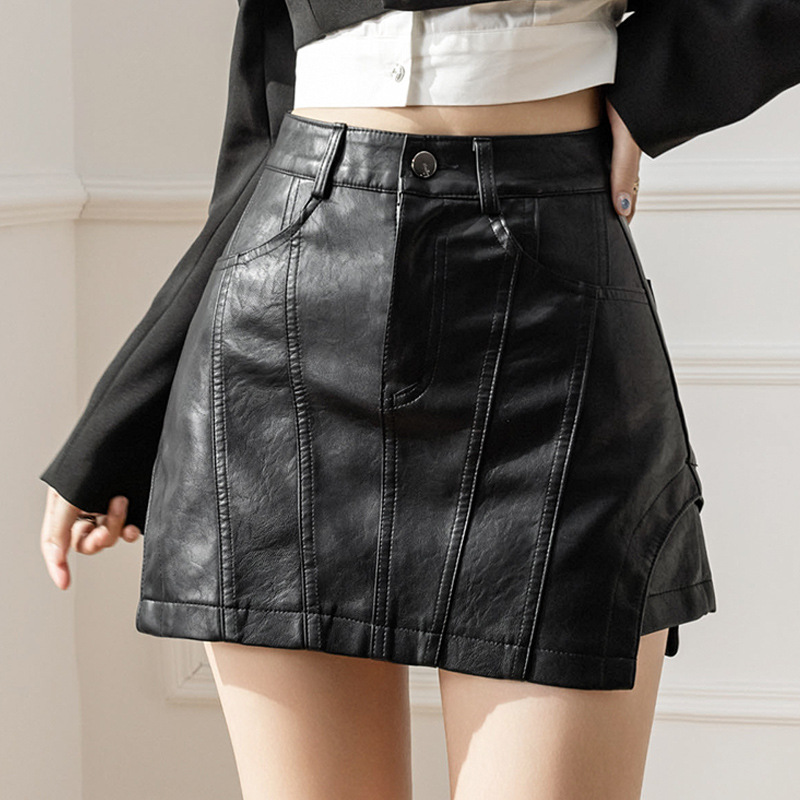 春秋新款PU皮裤裙女高温洗水开叉A字半身裙拼接高腰包臀热裤