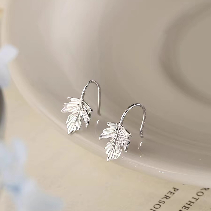 S999纯银耳钉女夏枫叶养耳洞睡觉免摘耳勾简约时尚通勤耳饰品