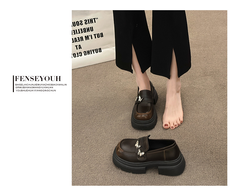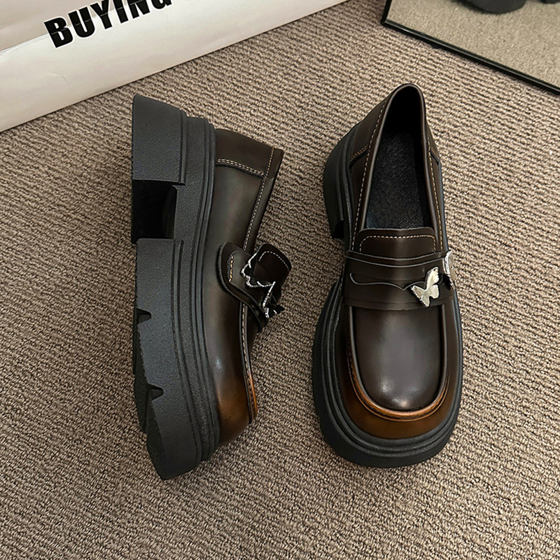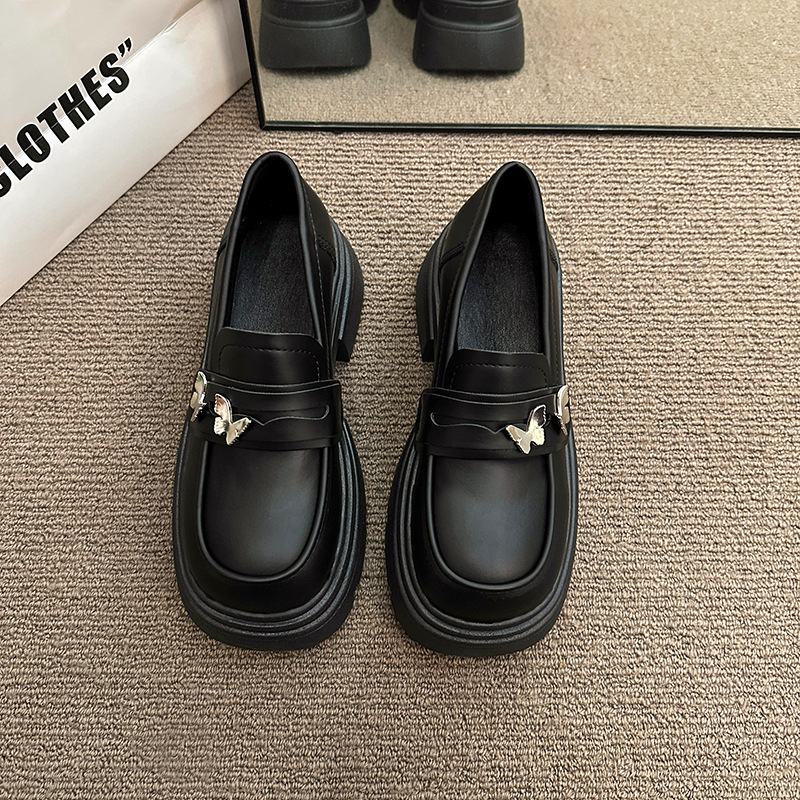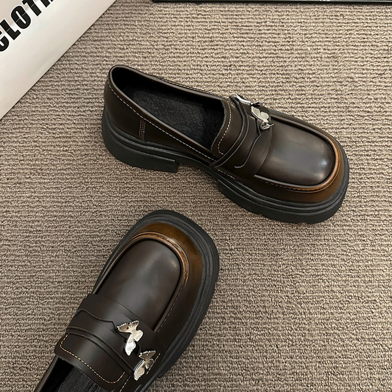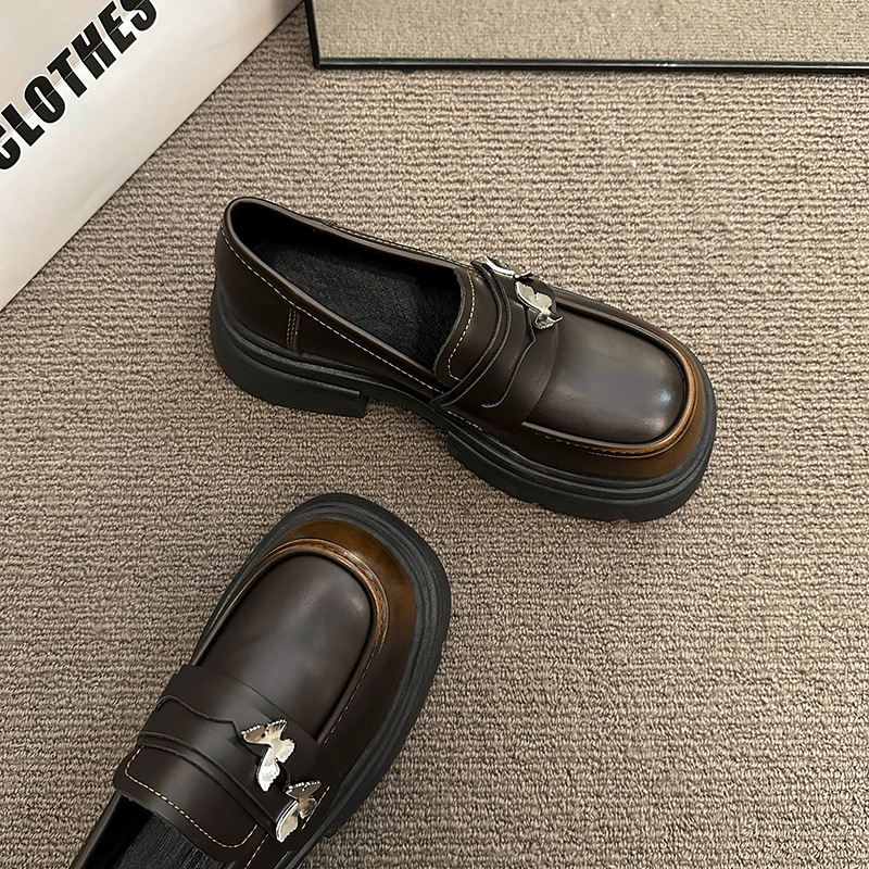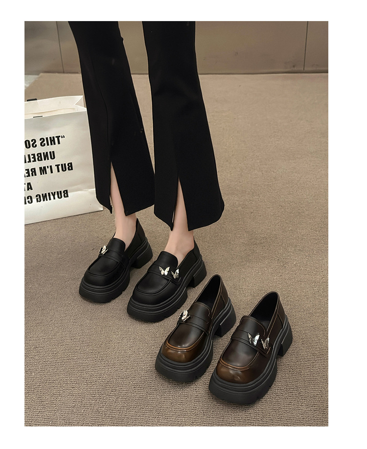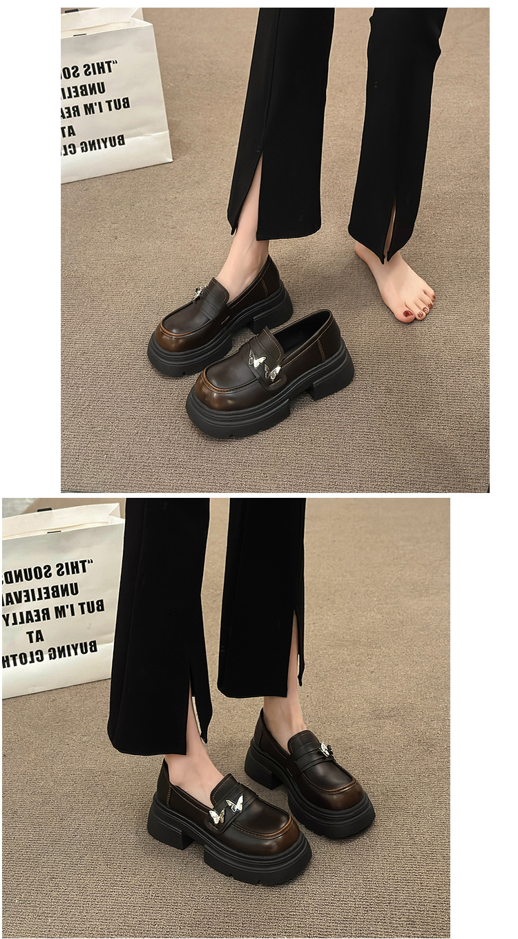复古擦色小皮鞋女春季新款英伦风蝴蝶百搭粗跟厚底增高乐福鞋