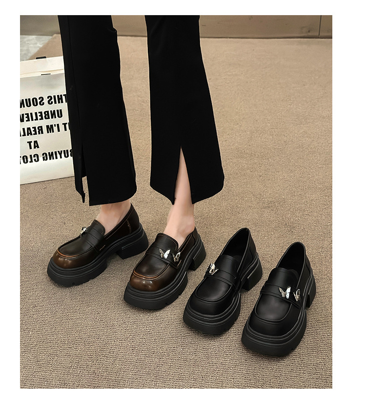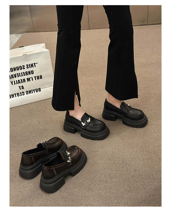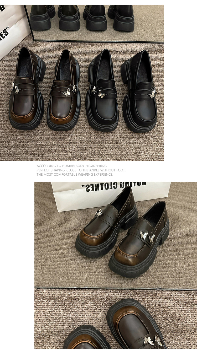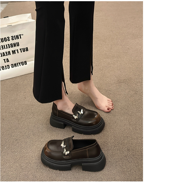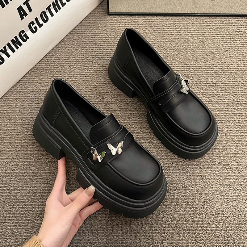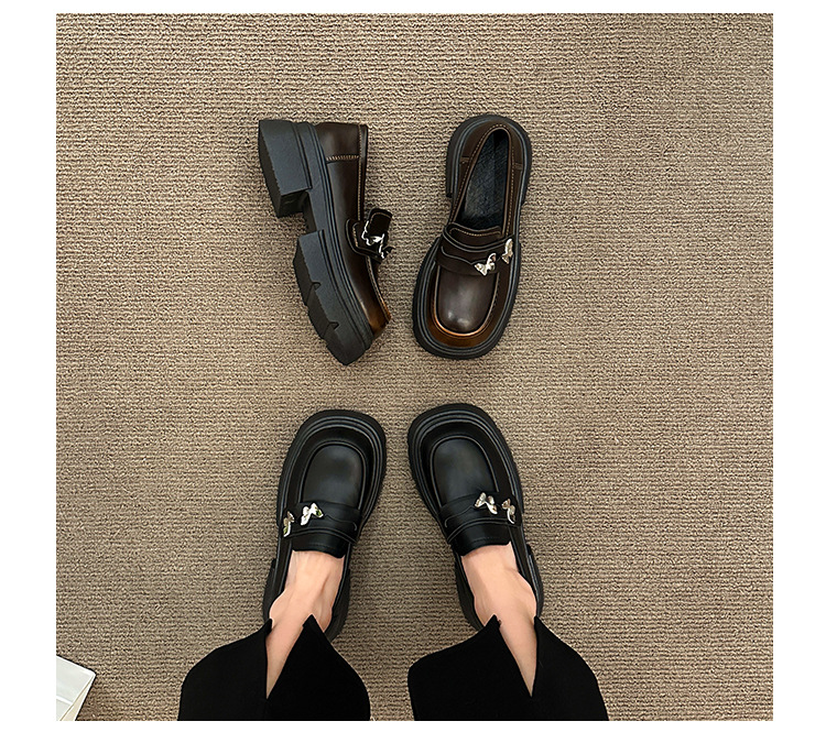 复古擦色小皮鞋女春季新款英伦风蝴蝶百搭粗跟厚底增高乐福鞋