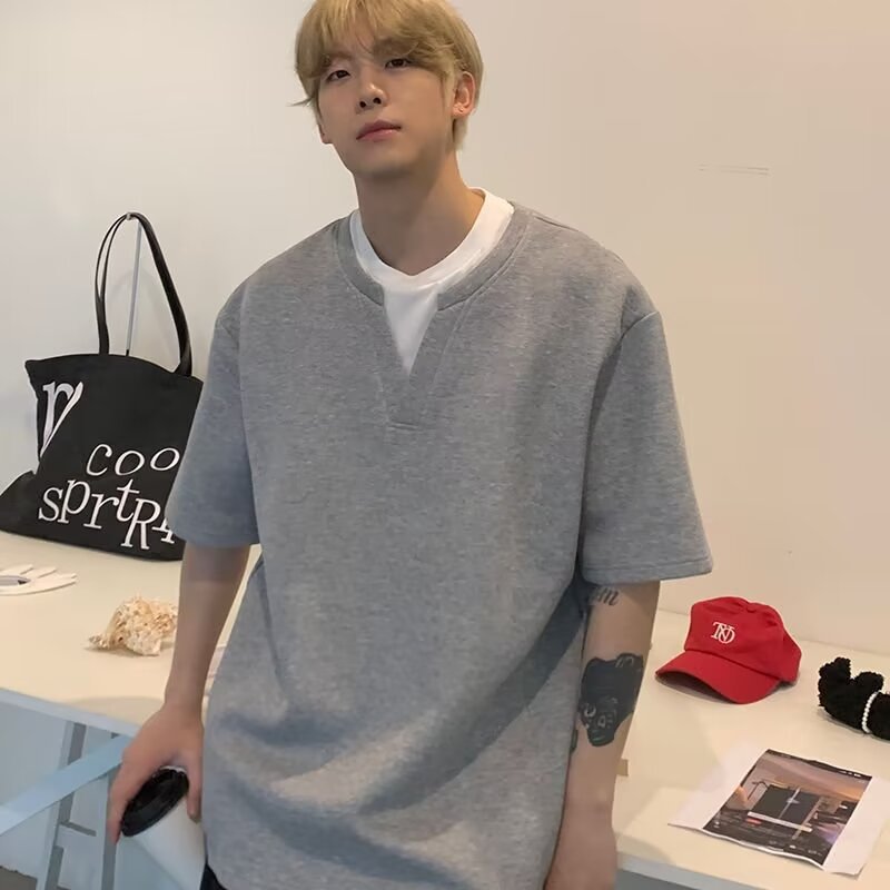 港风纯棉t恤设计感假两件V领短袖T恤男宽松夏季韩风简约百搭半袖