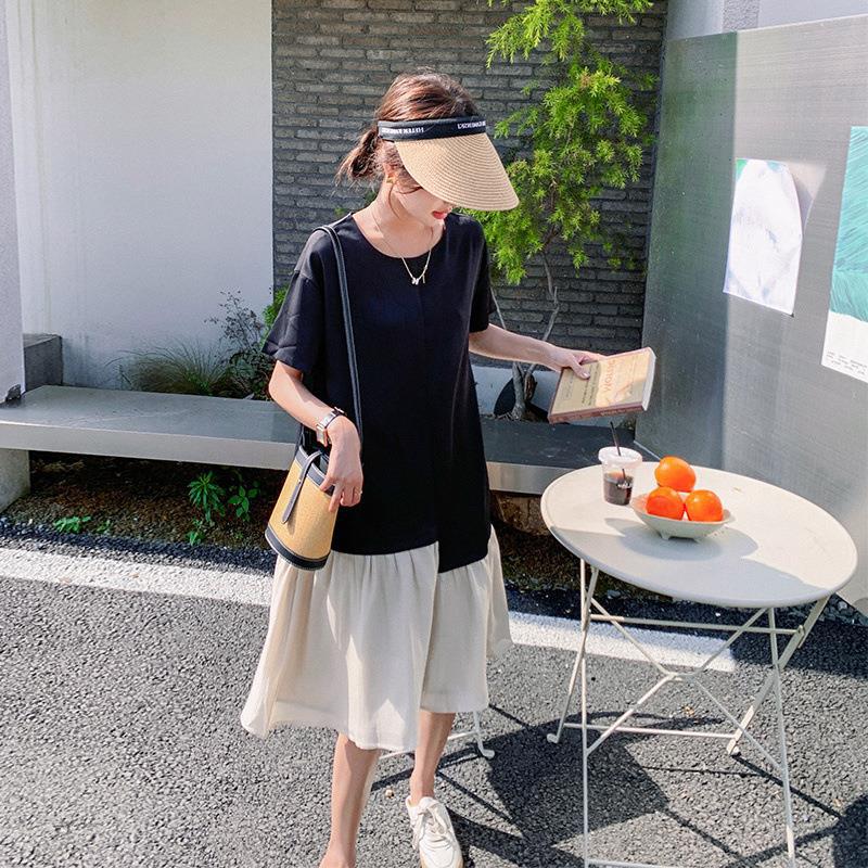 实拍百搭圆领休闲风宽松显瘦不规则撞色拼接裙摆中长款短袖连衣裙