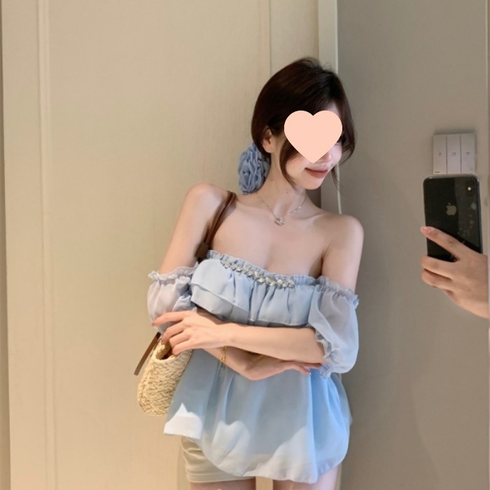 甜辣妹一字肩上衣女法式荷叶边泡泡袖衬衣夏季性感短款衬衫雪纺衫