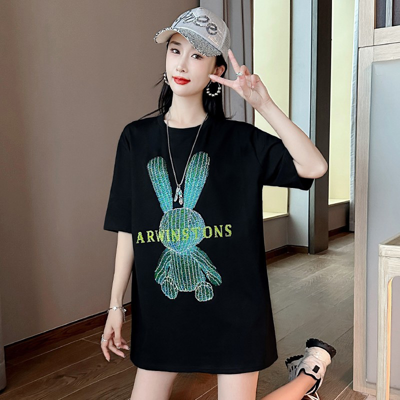 新款潮牌重工烫钻大码宽松短袖T恤女圆领休闲半袖打底上衣