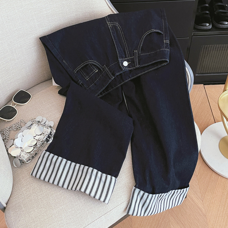 韩系条纹拼接翻边卷边牛仔裤女夏季高腰显瘦宽松直筒阔腿九分裤子