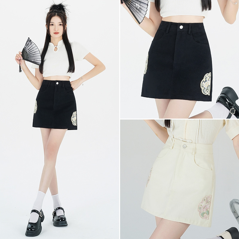 新中式国风刺绣半身裙女春夏新款牛仔A字裙高腰显瘦短裙