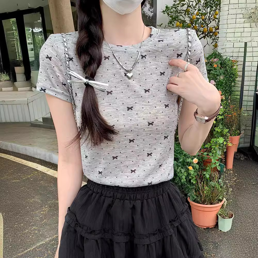 蝴蝶结印花甜美气质短袖圆领T恤短款修身夏季新款小个子女装