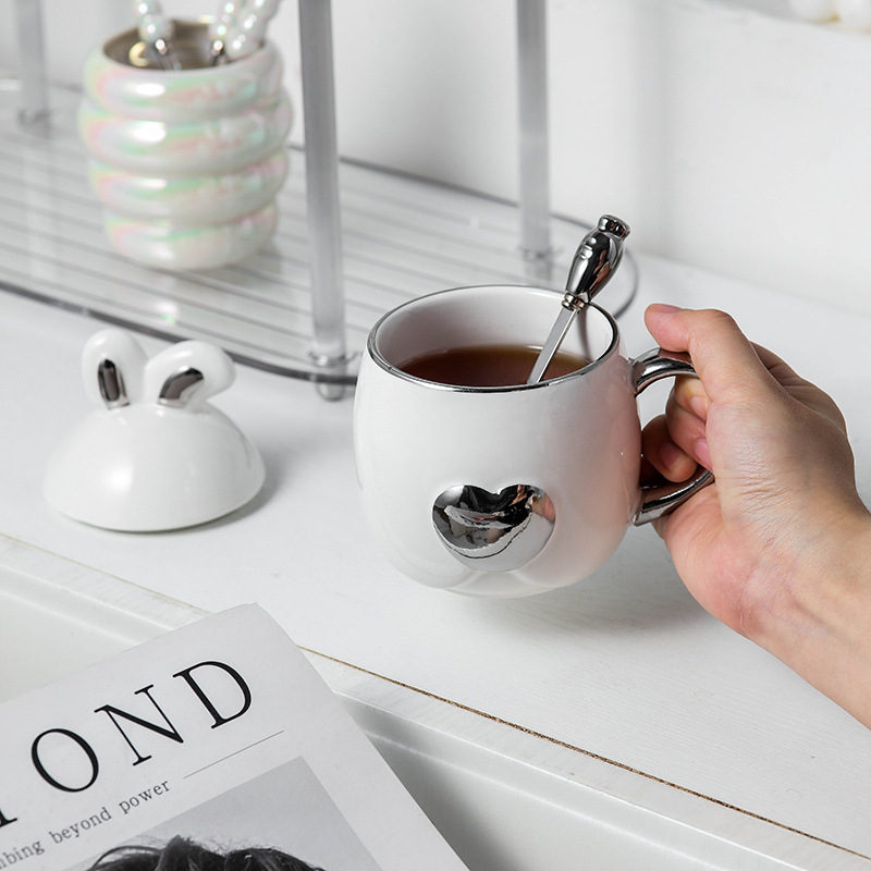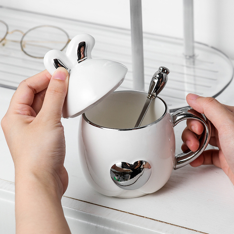 马克杯兔子伴手礼陶瓷杯水杯电镀银色高颜值高级感带盖子勺子礼物