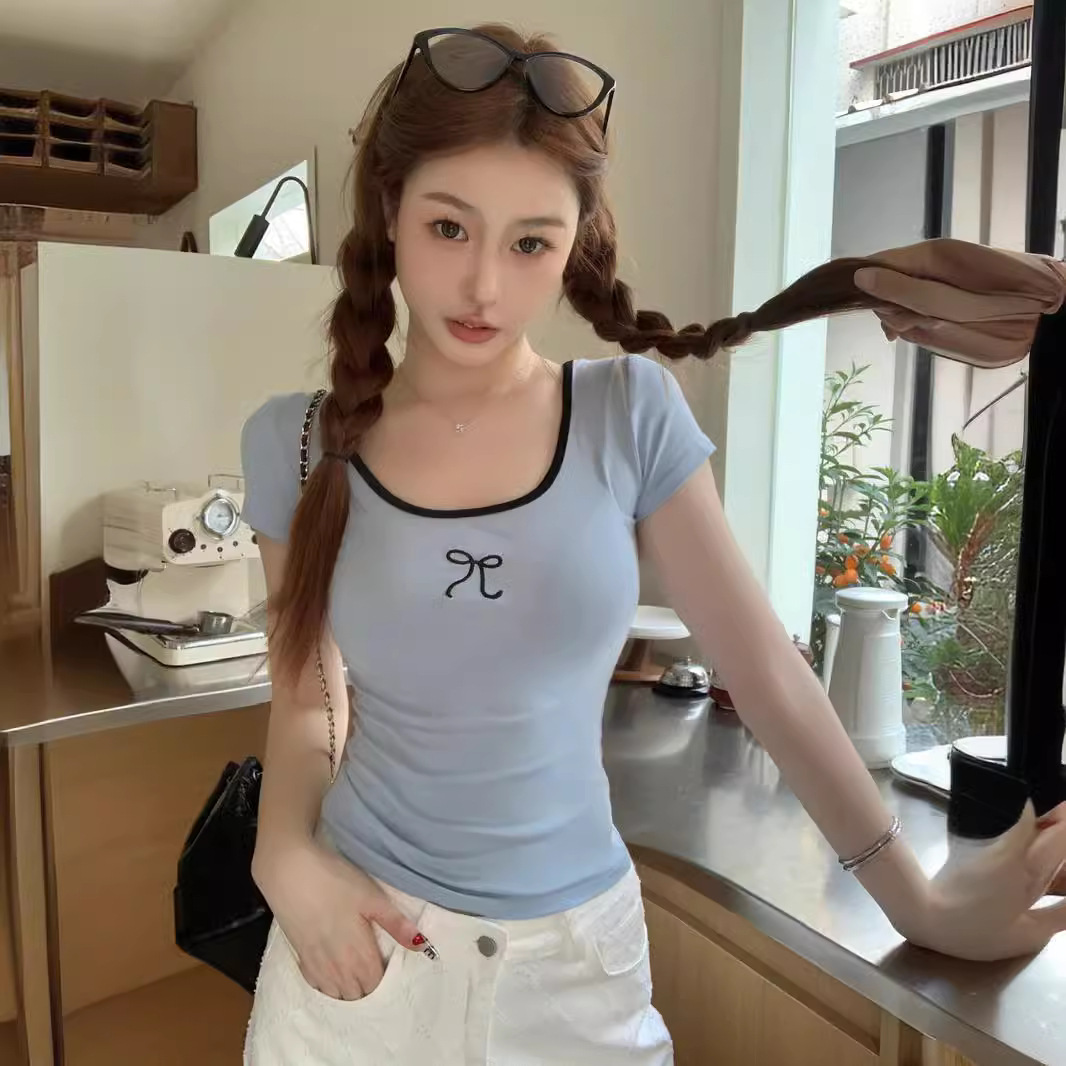 纯欲风蝴蝶结蓝色正肩短袖T恤女夏季修身显瘦薄款甜辣妹短款上衣