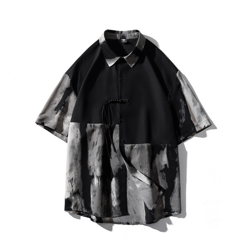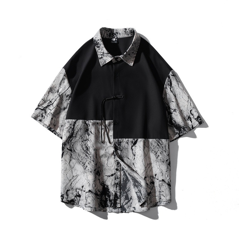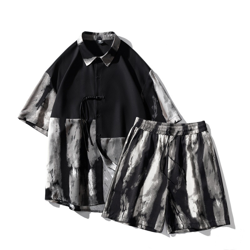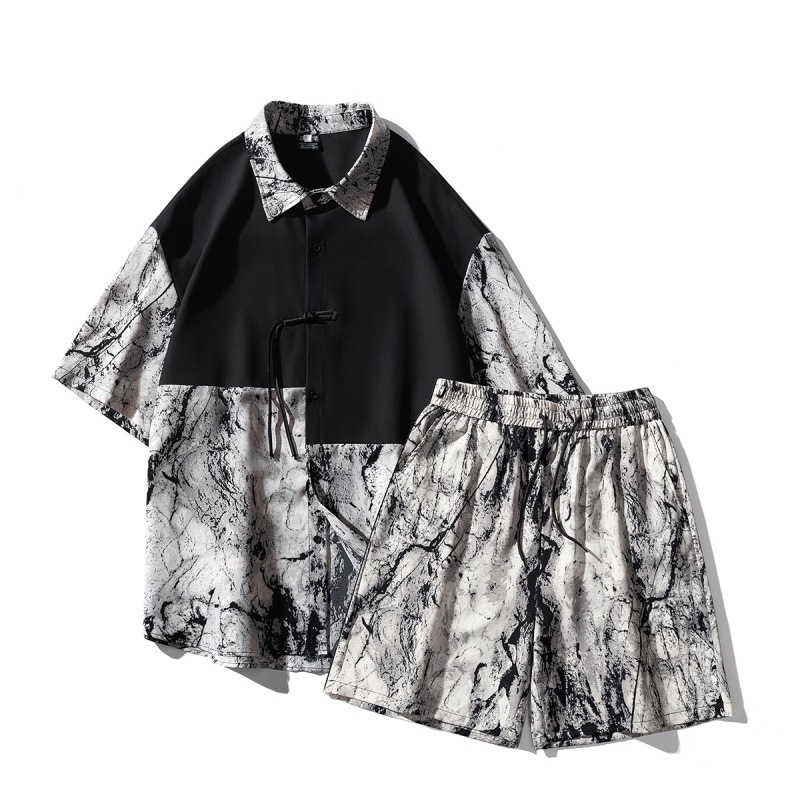 中国风男士休闲套装潮流时尚宽松拼色短袖衬衫短裤两件套外贸男装