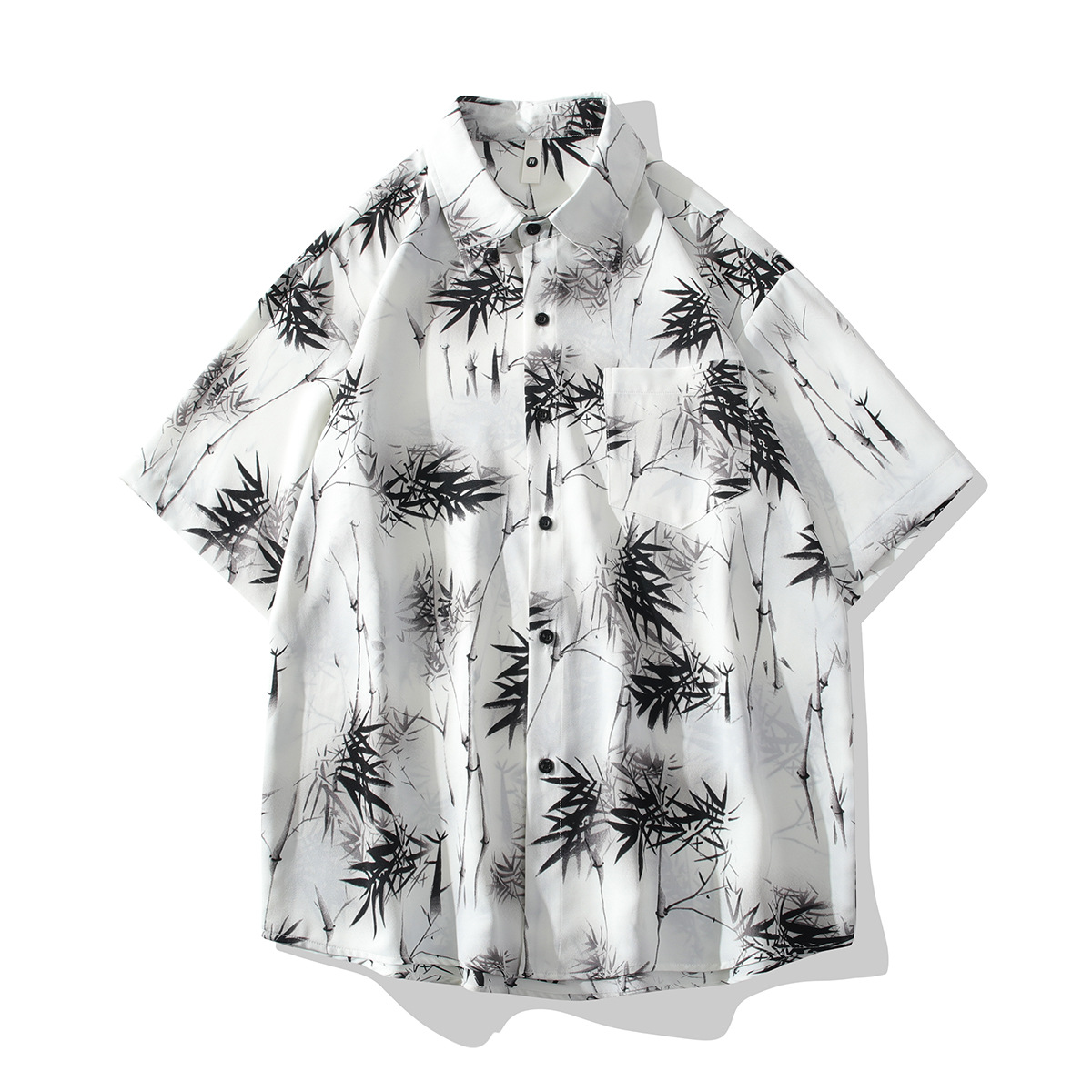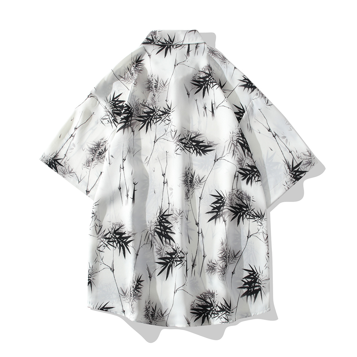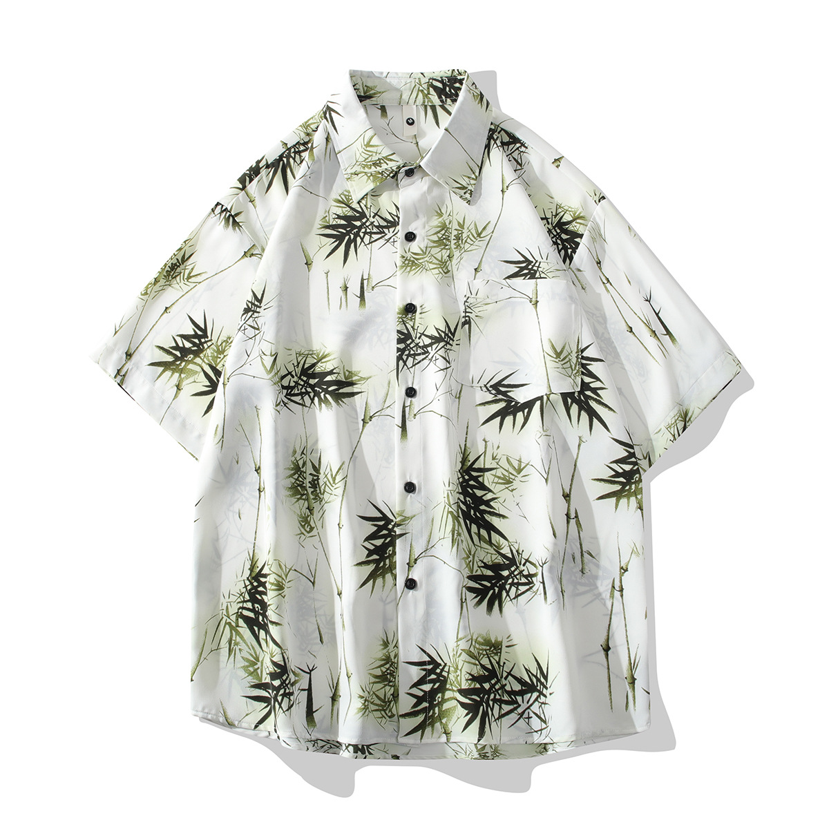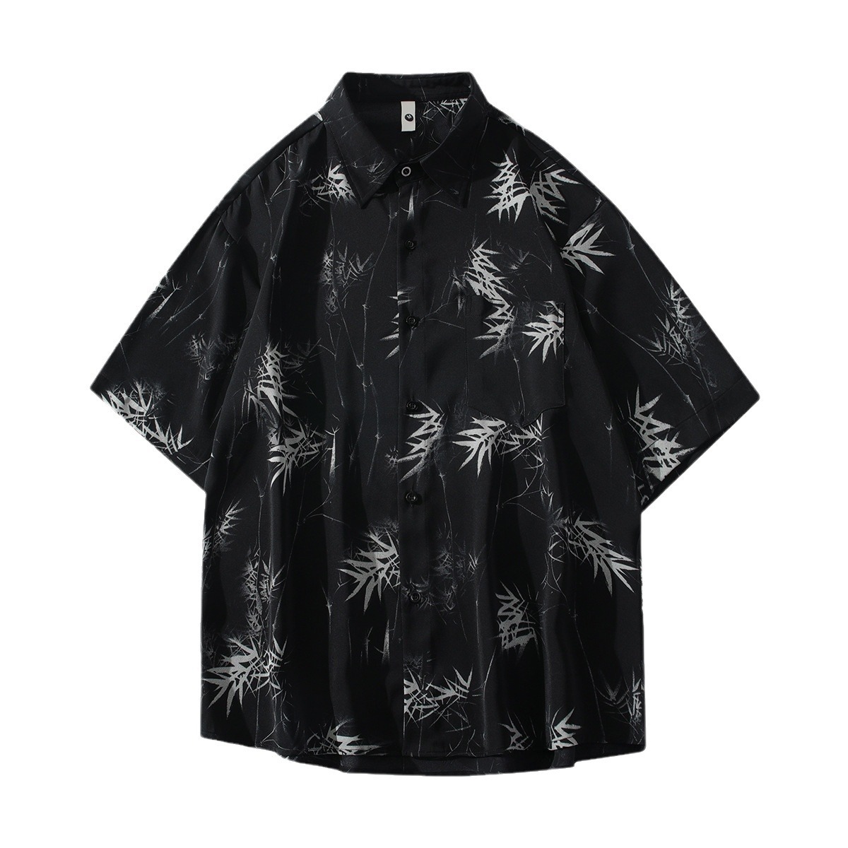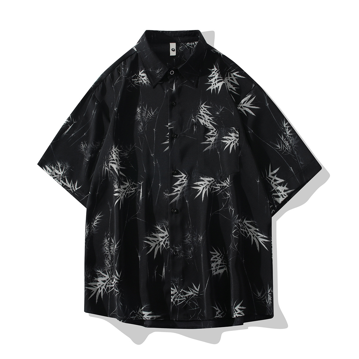 新款男士短袖衬衫 潮牌时尚冰丝竹叶印花宽松垂感衬衣男