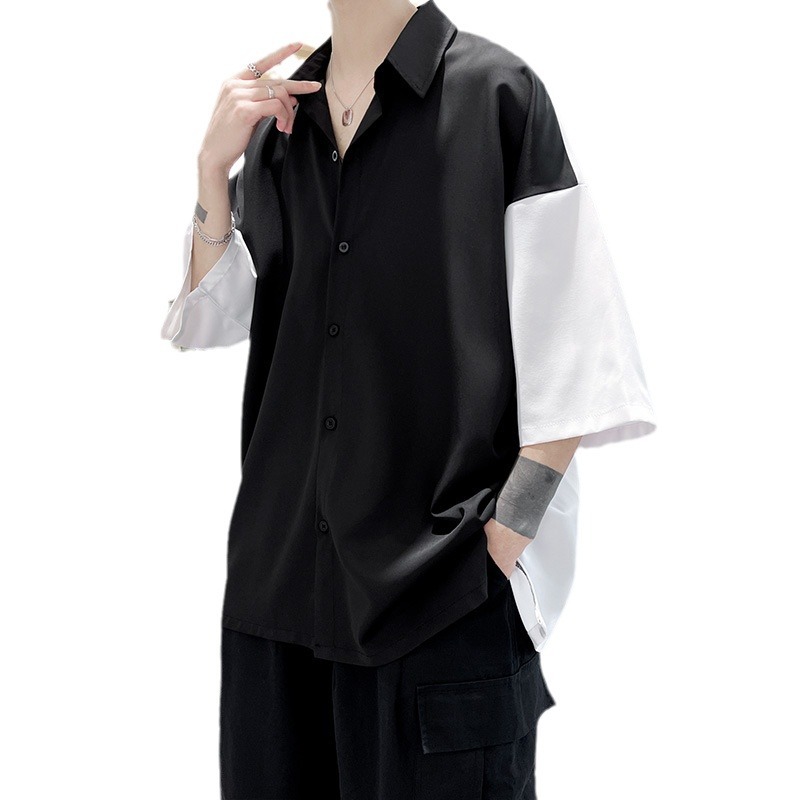 新款夏季男士短袖衬衫 时尚撞色拼接宽松大码休闲衬衣男上衣
